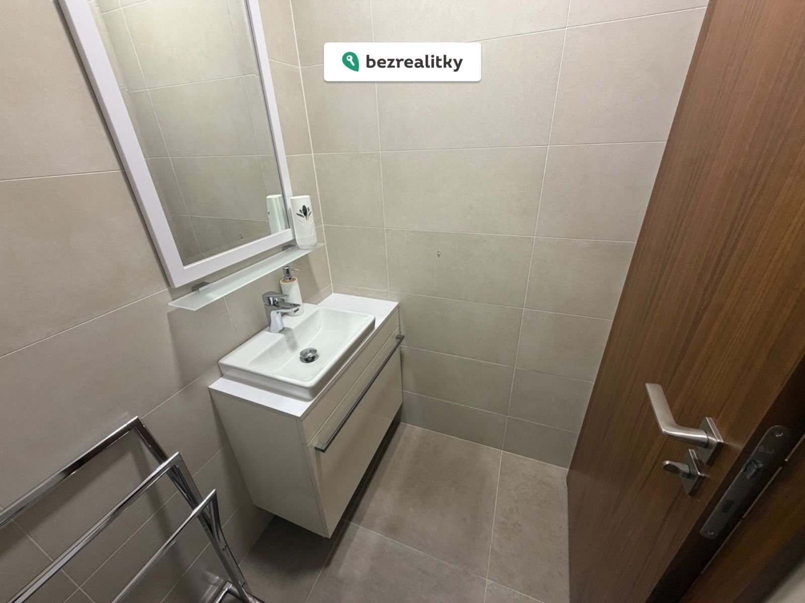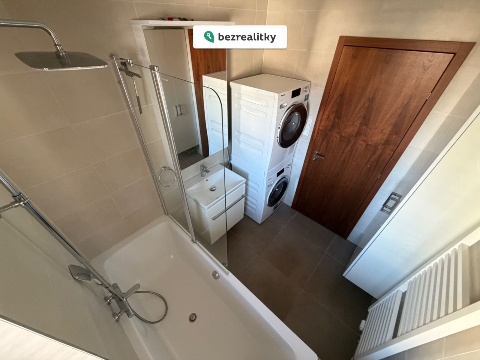 Hlavní koupelna je vybavena vanou se sprchovou zástěnou a prakticky řešeným prostorem pro pračku a sušičku. Velkým benefitem je také samostatné WC, které zvyšuje komfort každodenního bydlení i při návštěvách. Použité velkoformátové obklady a moderní zařizovací předměty podtrhují kvalitní standard provedení.