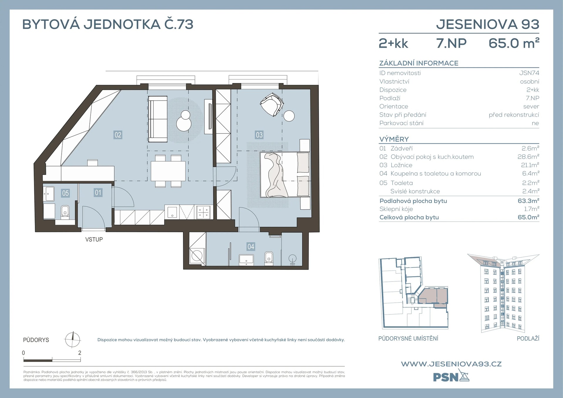 Prostorná bytová jednotka o dispozici 2+kk a podlahové ploše 63,3 m² je součástí projektu Jeseniova 93, který citlivě propojuje noblesu historického domu s moderním komfortem. Dům se nachází přímo na Žižkově – v živé čtvrti plné kaváren, restaurací a kultury, jen pár kroků od parku Vítkov a v minutové vzdálenosti od zastávky tramvaje Biskupcova.