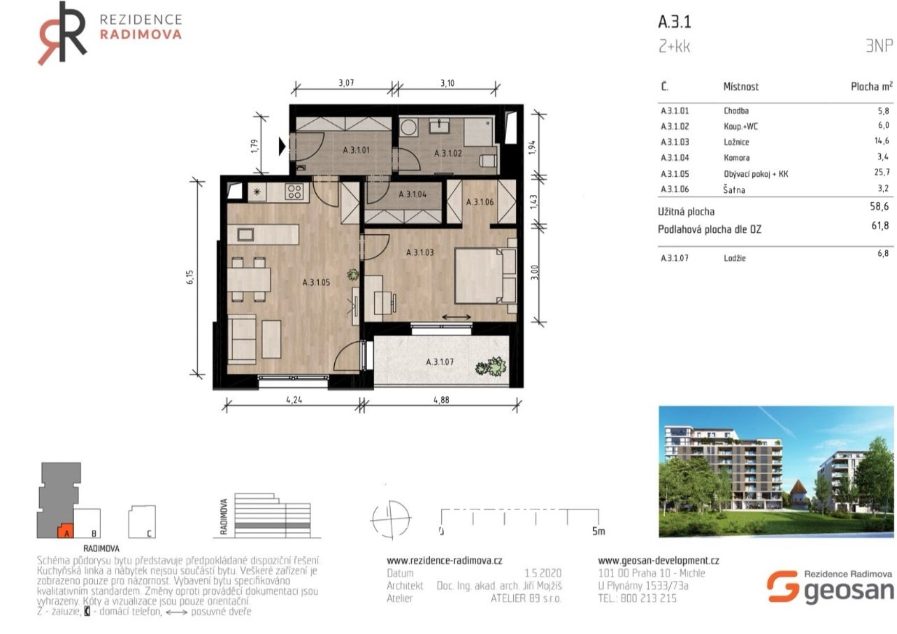Dovolte mi představit Vám mimořádnou příležitost získat moderní byt 2+kk o celkové ploše 63 m² v prestižní novostavbě Rezidence Radimova, která se nachází v klidné a zároveň výborně dostupné části Prahy 6 - Břevnova. Tento byt představuje dokonalou kombinaci luxusního bydlení, promyšleného designu a jedinečného historického prostředí. Byt je zcela nový, nikdy neobývaný, byl teprve nedávno předán developerem, takže budete jeho prvními uživateli.