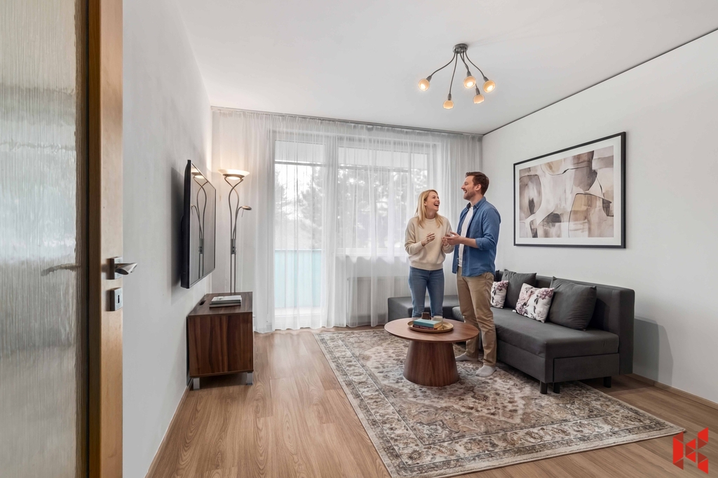 ✔ balkon přístupný z obývacího pokoje (+ dalších 6,54m²),