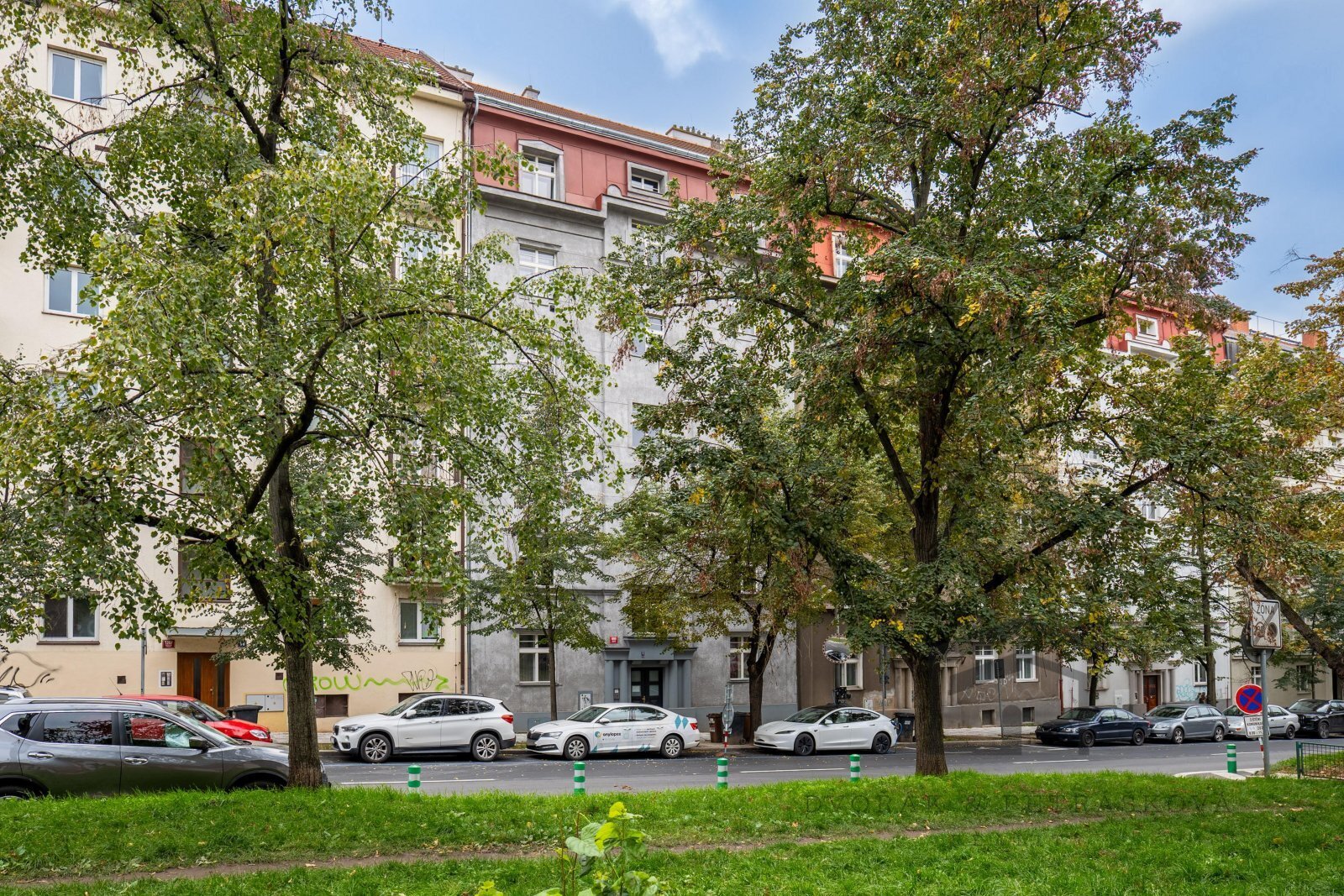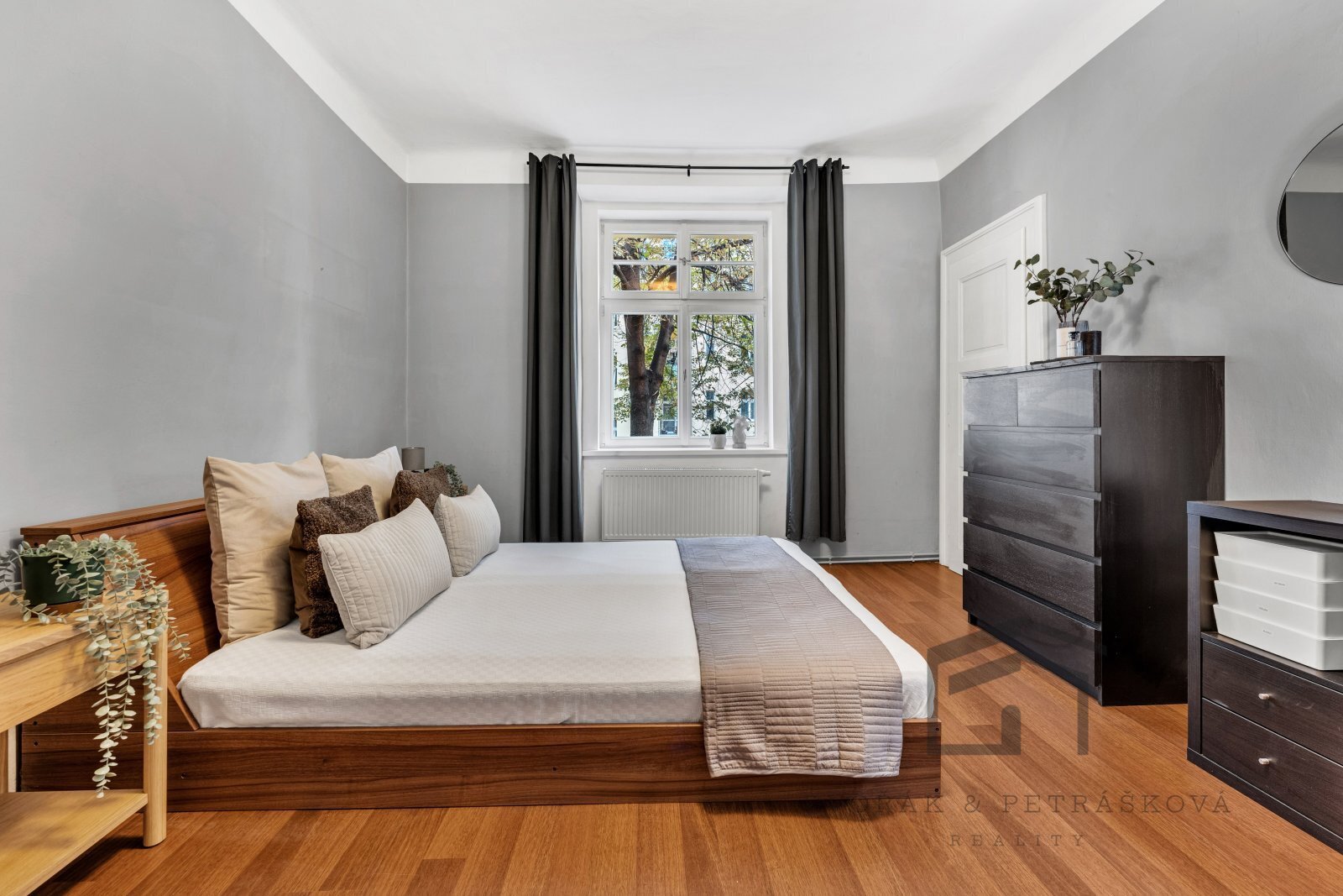 Byt s podlahovou plochou 62 m2 se nachází v prvním nadzemním podlaží a disponuje předsíní, na kterou navazuje kuchyňský kout s oknem do klidného dvora, samostatnými vstupy do obou pokojů (obývacího pokoje a ložnice), do koupelny a na toaletu. Obývací pokoj (25 m2) s dřevěnou podlahou a vysokými stropy je orientovaný do ulice, ložnice (19 m2) je umístěna separátně s okny do dvora a se vstupem do komory - ta vám může posloužit jako menší šatna. Kuchyňský kout (8,6 m2) je vybavený myčkou na nádobí, lednicí s mrazákem, elektrickou horkovzdušnou troubou, mikrovlnou troubou, plynovým sporákem a dostatkem úložného prostoru. Koupelna s vanou a pračkou je umístěna od toalety separátně. Okna jsou špaletová s dvojitým rámem (vnějším a vnitřním). Vytápění bytu a ohřev vody zajišťuje plynový kotel se zásobníkem na vodu. Byt je dle prohlášení vlastníka klasifikován jako 2+kk, současná dispozice je však 2+1. K bytu náleží velká sklepní kóje cca 5 m2.