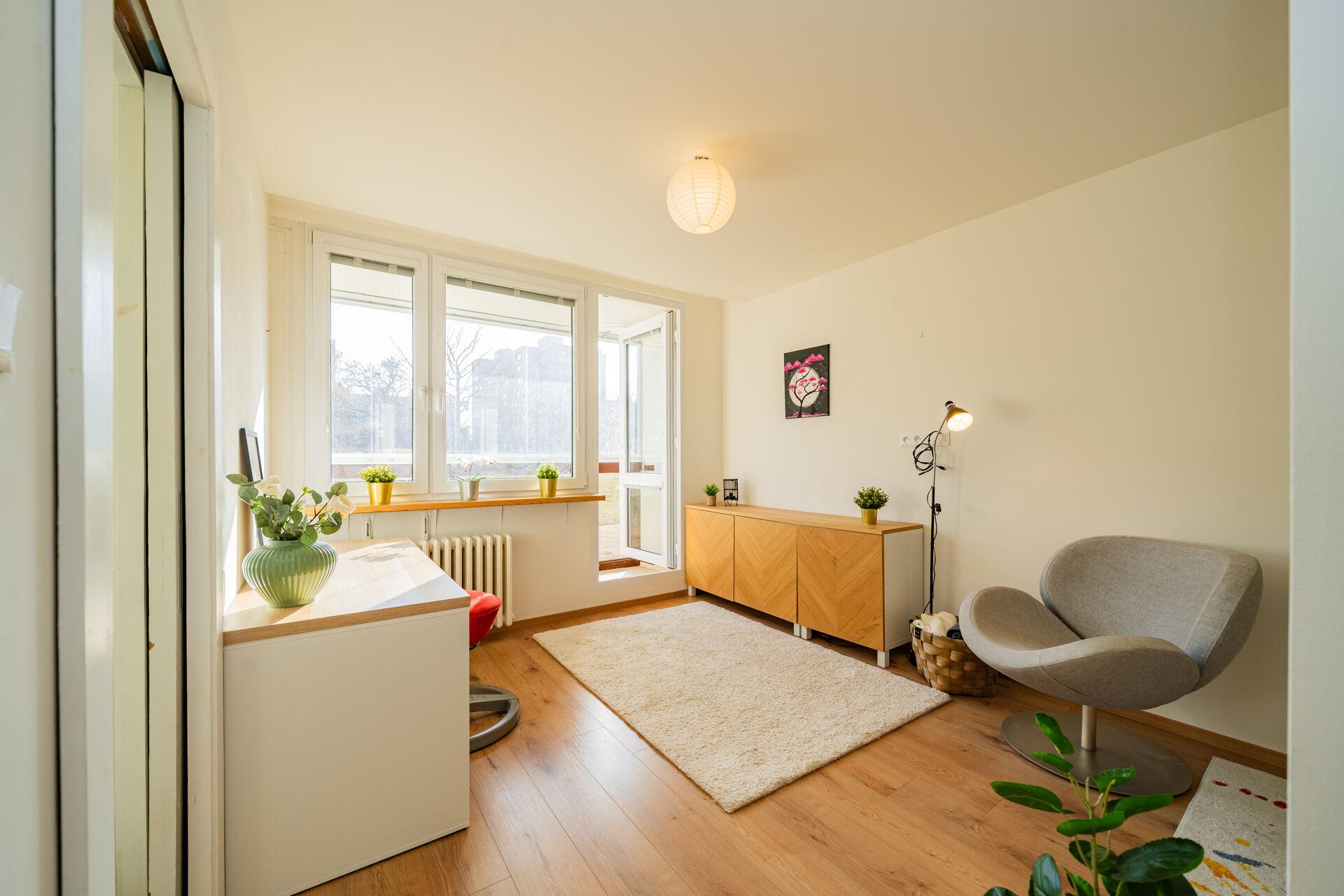 Nabízíme ke koupi krásný byt 2kk/L s celkovou rozlohou 49 m2 včetně lodžie, v panelovém domě po revitalizaci. V rámci této revitalizace byla dostavěná zmiňovaná zasklená lodžie orientovaná do slunného vnitrobloku plného zeleně. Byt prošel v minulosti rekonstrukcí a jeho dispozice jsou uživatelsky příjemné a praktické. Kuchyně je vybavená kuchyňskou linkou s ručně vyráběnými obklady. Obývací pokoj se vstupem na lodžii bytu je účelně rozdělený na pracovnu a relaxační část, kterou majitelé využívají jako plnohodnotný prostor pro příležitostné spaní. Ložnice je samostatná. V chodbě je velkorysý úložný prostor zajišťující možnost uskladnění věcí. Koupelna s toaletou, rohovou vanou. Přímo vedle bytu je komora a v suterénu sklep.