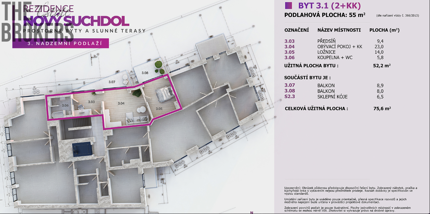 Celková plocha bytu je 75,6 m2 a skládá se z bytové jednotky o dispozici 2+kk ( 52,2 m2) a dvou balkonů ( 8,9 m2 a 8 m2). Jeden navazuje na obytnou místnost a druhý je součástí ložnice. Jednotka je umístěna ve 2. patře. Součástí bytu je sklepní kóje ( 6,5 m2) a lze dokoupit garážové stání v podzemní garáži domu.