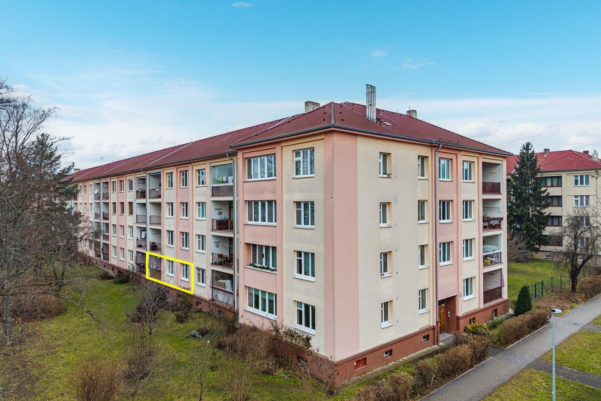 Nabízíme k prodeji světlý a prostorný byt 3+1 o velikosti 100 m², s balkónem 7,5 m², komorou 3 m² a sklepem 6 m², ve zvýšeném přízemí čtyřpatrového domu se zahradou.