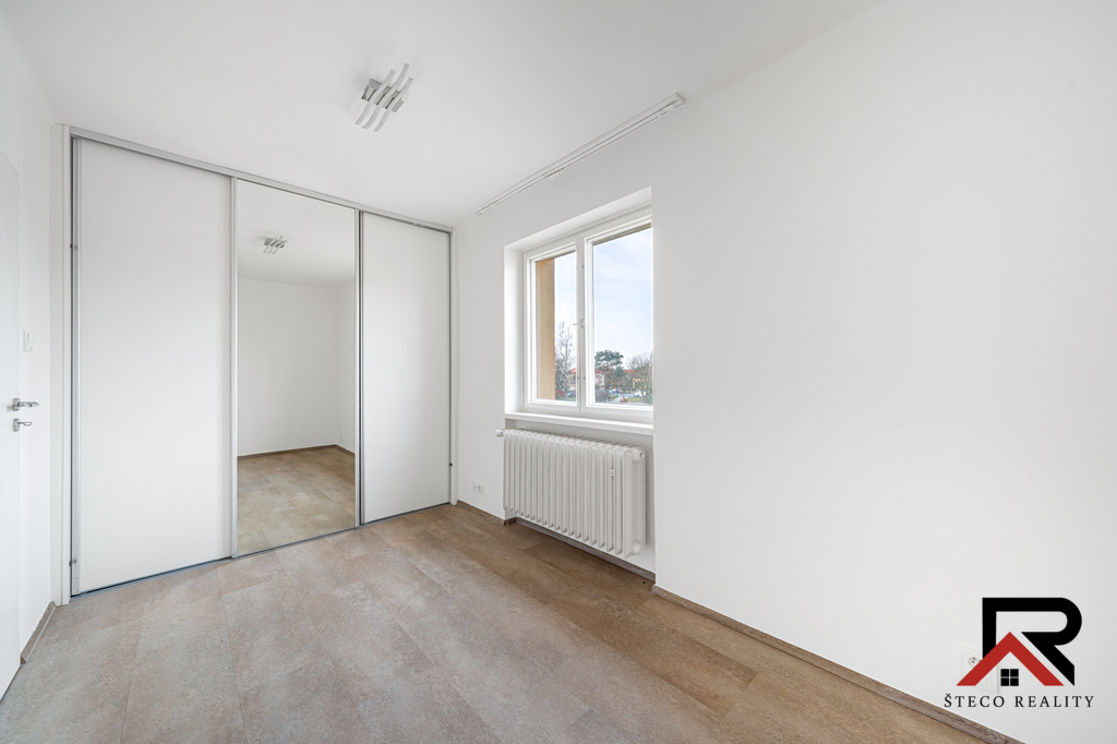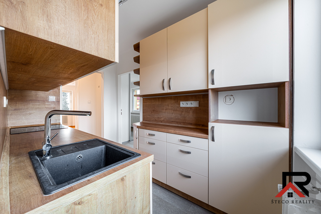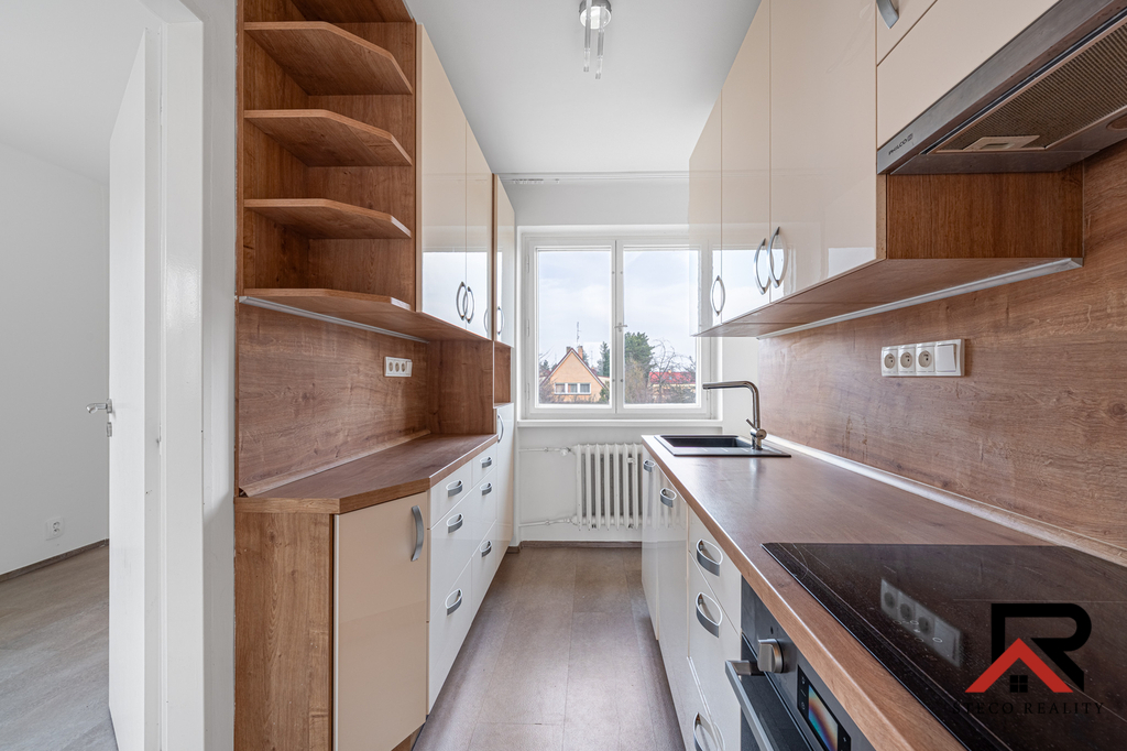 Byt prošel celkovou rekonstrukcí a nabízí moderní kuchyňskou linku s vestavnými spotřebiči (varná deska, trouba, digestoř, granitový dřez), nové podlahy v celém bytě, zrekonstruovanou koupelnu s vanou a WC a pokoj s vestavěnou šatní skříní se zrcadlovými dveřmi. Vytápění je zajištěno radiátory a plynovým kotlem.