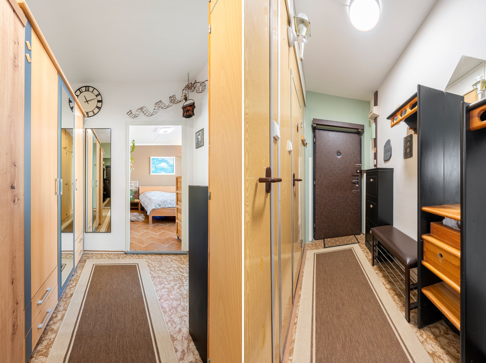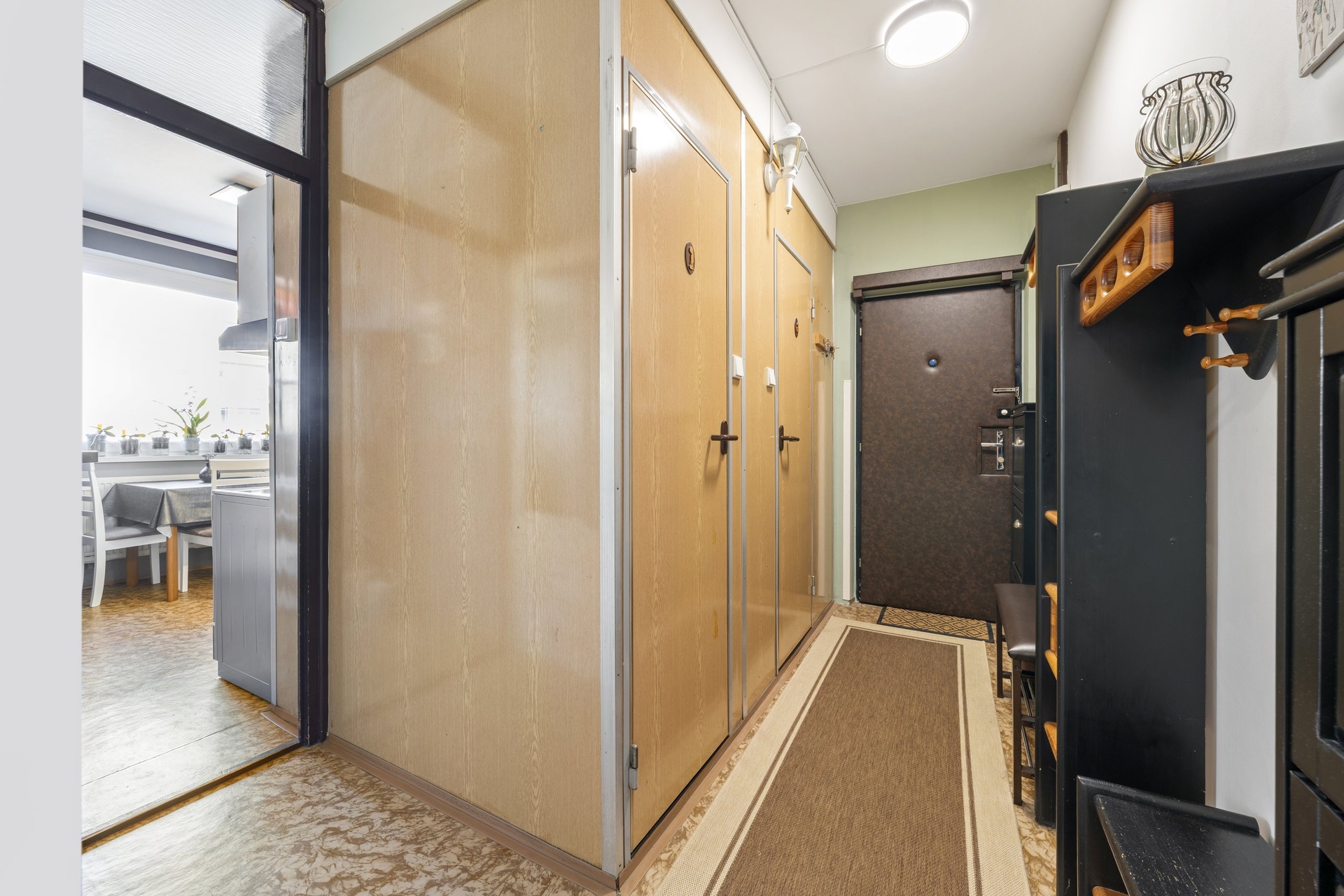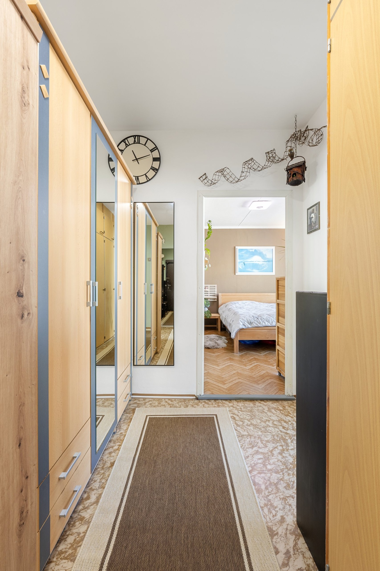 Velkou výhodou bytu je prostorná vstupní chodba, ze které je samostatný vstup do všech místností – obývacího pokoje, dvou ložnic ( jedna ložnice se vstupen do lodžie), samostatné kuchyně s dostatkem místa pro jídelní stůl, koupelny s vanou a odděleného WC. Chodba svou velikostí nabízí dostatek prostoru pro vestavné skříně a další úložné prostory.