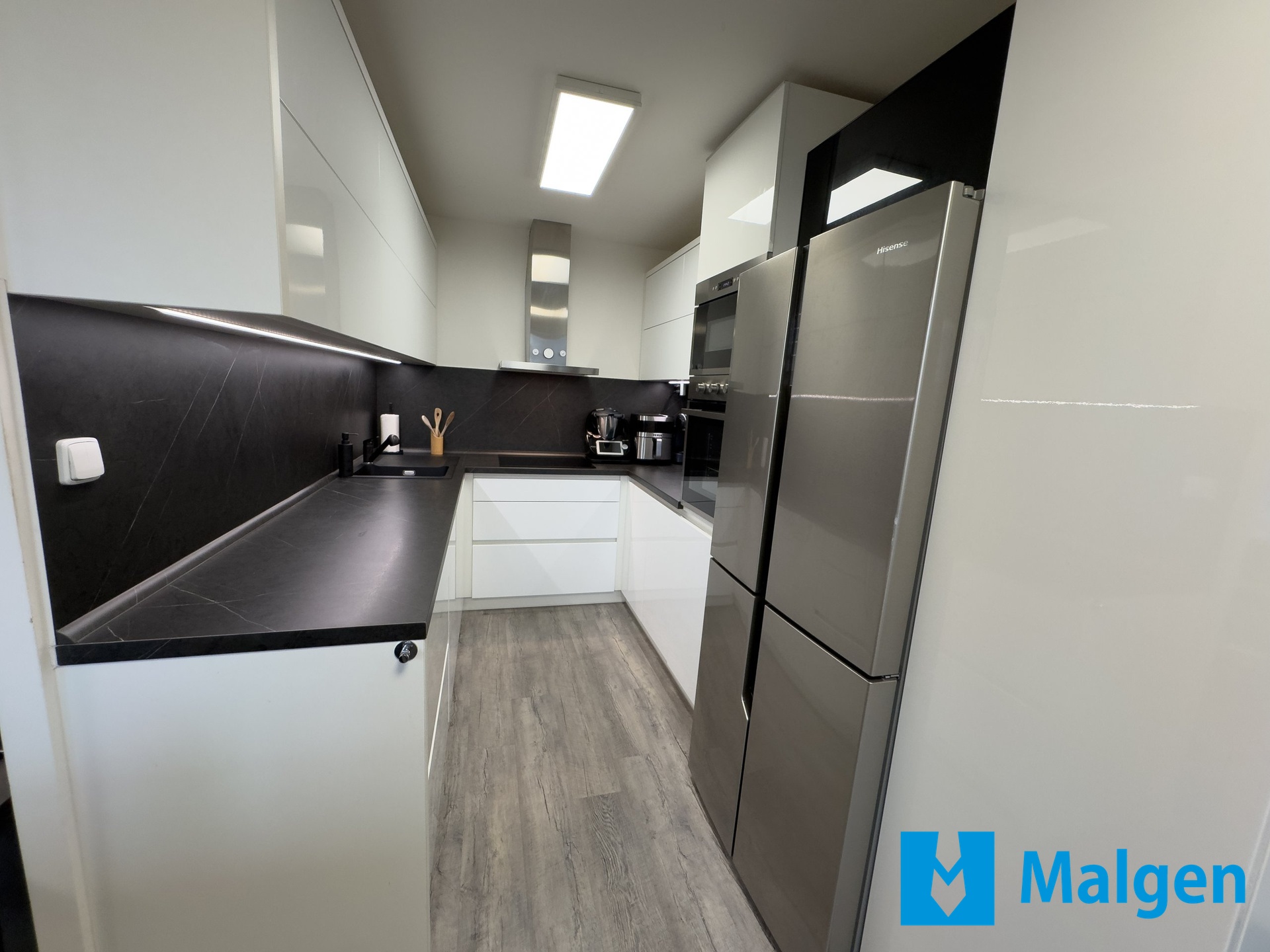Byt zaujme moderním standardem — vinylové podlahy, podlahové topení v koupelně i na WC, koupelna a toaleta jsou navíc prakticky oddělené. Kuchyňská linka je vyrobena na míru a všechny spotřebiče včetně americké lednice v bytě zůstávají. Dispozice je velmi praktická: obývací pokoj plynule navazuje na kuchyňský kout, dva samostatné neprůchozí pokoje jsou aktuálně využívány jako ložnice a pracovna. K bytu náleží také prostorná zasklená lodžie.