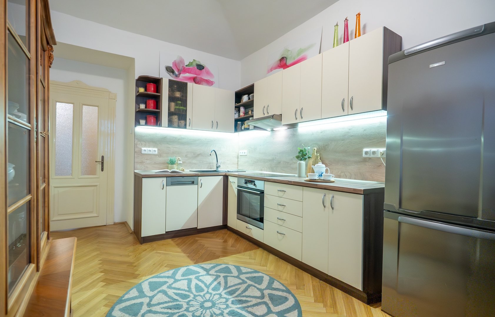 Jednotka prošla kompletní rekonstrukcí – nové rozvody, topení, podlahy, izolace, koupelna i toaleta. V interiéru byly citlivě zrenovovány původní dveře se secesními zárubněmi a mosaznými klikami, které podtrhují historický charakter domu.