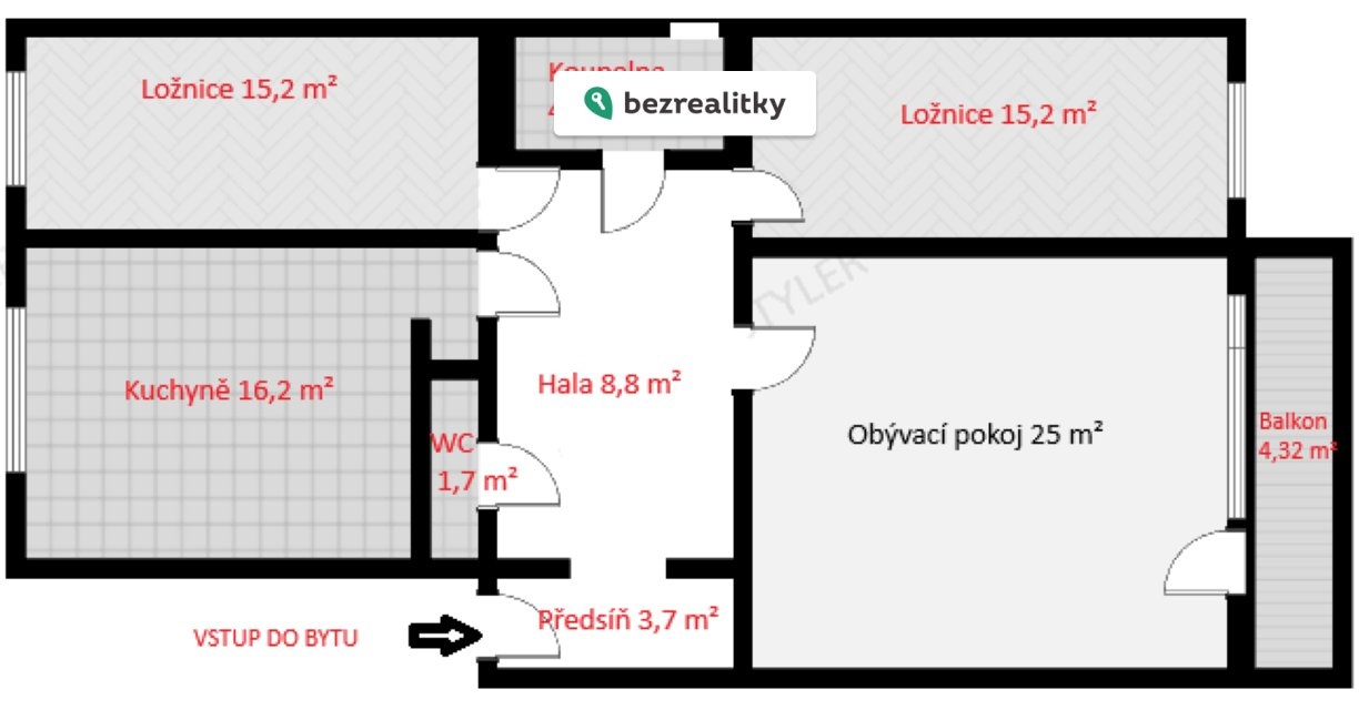 Kuchyně 16,2 m², obývací pokoj 25,2 m², dvě samostatné ložnice každá o velikosti 15,2 m², koupelna 4,2 m², WC 1,7 m², předsíň 3,7 m², hala 8,8 m².