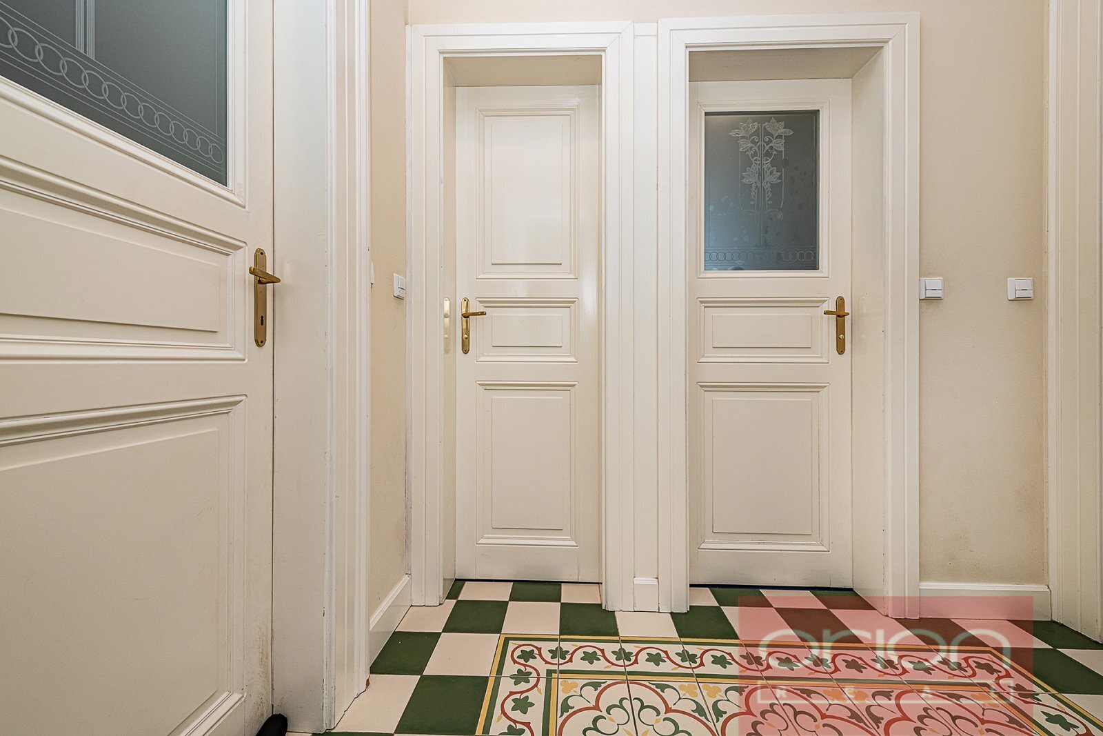Dispozice bytu nabízí předsíň, halu, samostatnou kuchyň s jídelním koutem, obývací pokoj, dvě ložnice, koupelnu s vanou, sprchovým koutem a toaletou, a dále samostatnou toaletu s umývadlem. Jedna ložnice a kuchyň jsou orientované do vnitrobloku. Součástí prodeje je kuchyňská linka (IKEA) se spotřebiči (varná deska, trouba, lednice s mrazákem, myčka nádobí, pračka, sušička), vestavěné skříně v pokojích a v předsíni. Interiér bytu je laděn do přírodních materiálů - repasovaná špaletová okna, renovované dřevěné dveře s pískovanými skly, renovované parkety a vysoké stropy dodávají bytu příjemnou a útulnou atmosféru. V koupelně je podlahové topení, vytápění je plynovým kotlem Vaillant.
