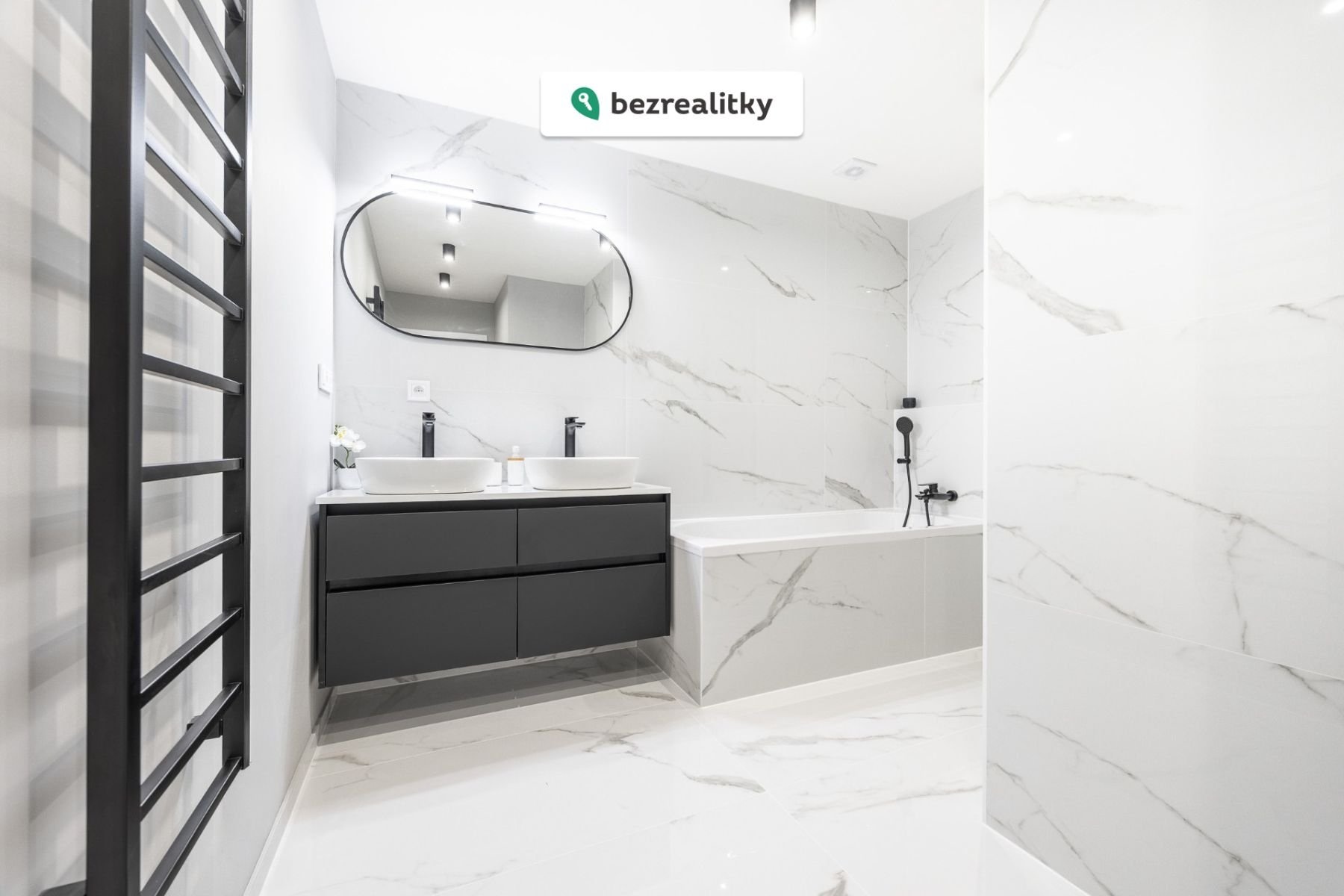 - nová sanita (vana, sprcha, 3 umyvadla, 1x skříňka, toaleta)