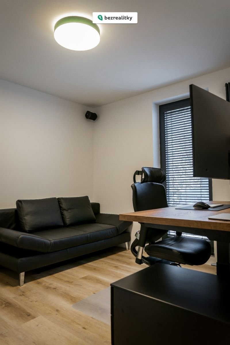 Dominantou bytu je velkorysý obytný prostor, který propojuje obývací část, terasu, jídelnu a prostornou kuchyni. Ložnice poskytuje soukromí a klid díky výhledu do zeleně vlastní zahrady a je propojená se samostatnou šatnou. Pracovna / druhý pokoj nabízí přímý vstup na terasu o velikosti cca 20 m² (sice není součástí bytu, ale je přístupná pouze jeho obyvatelům), ideální pro home office nebo dětský pokoj. Koupelna je provedena v luxusním tmavém dekoru s velkoformátovými obklady, walk-in sprchovým koutem. Toaleta je samostatná. Byt má velkorysé úložné prostory: šatnu a vestavěné skříně v obou pokojích.