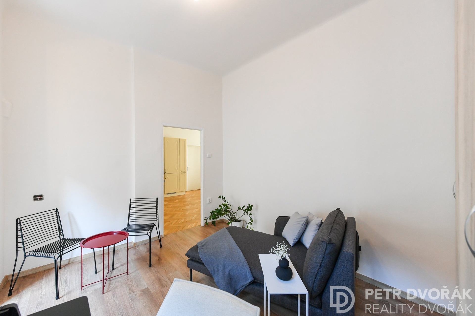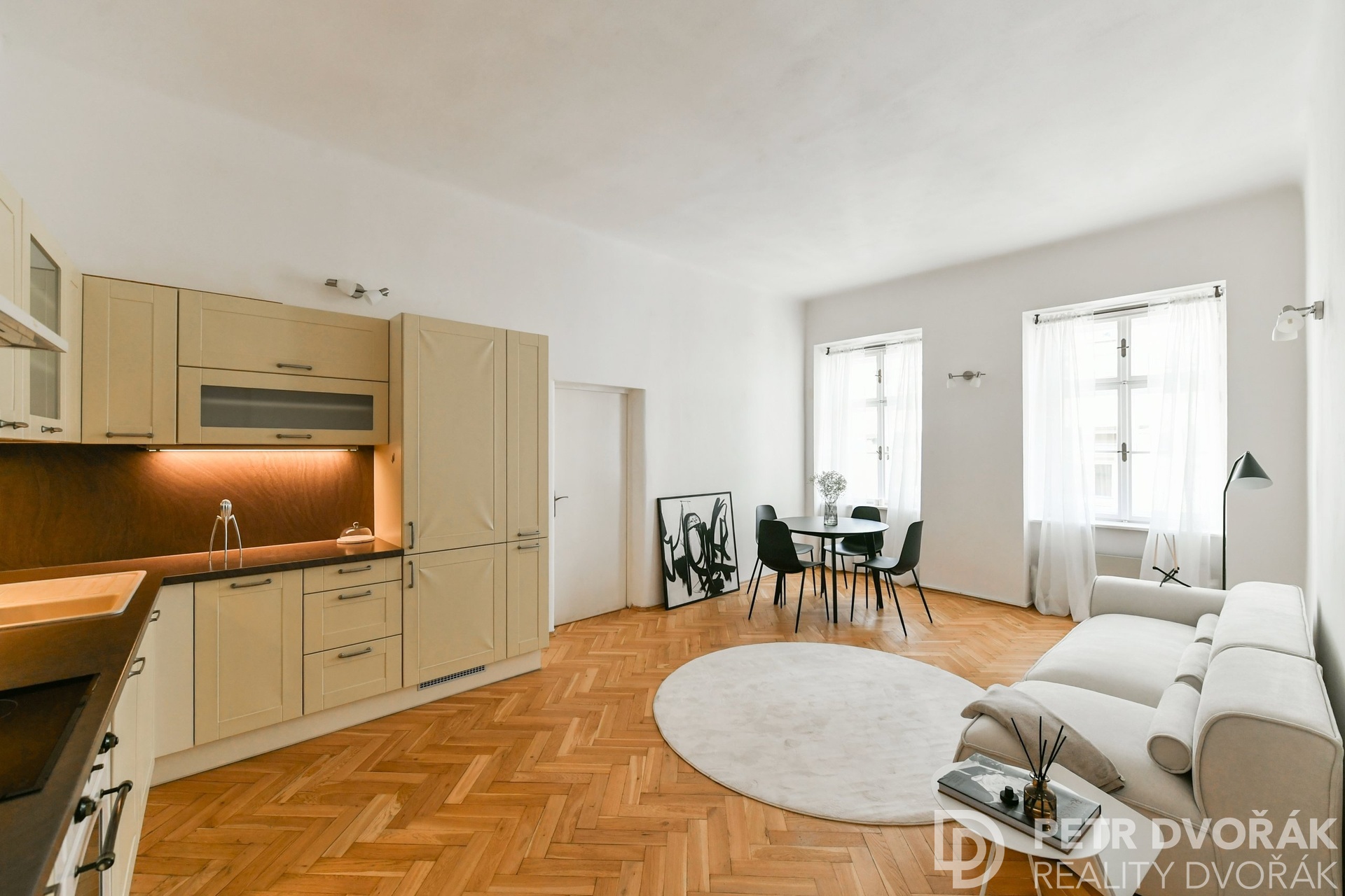 Pak obývací pokoj s kuchyňským koutem. Dvě kastlová okna s hlubokými špaletami otevřená do Haštalské ulice – ráno tudy nikdo nespěchá, turisté ji nenajdou, zní tu kroky. Kuchyň je vyrobena na míru: lednice s mrazákem, myčka, trouba, varná deska. Na podlaze původní parkety, nově renovované v roce 2024.