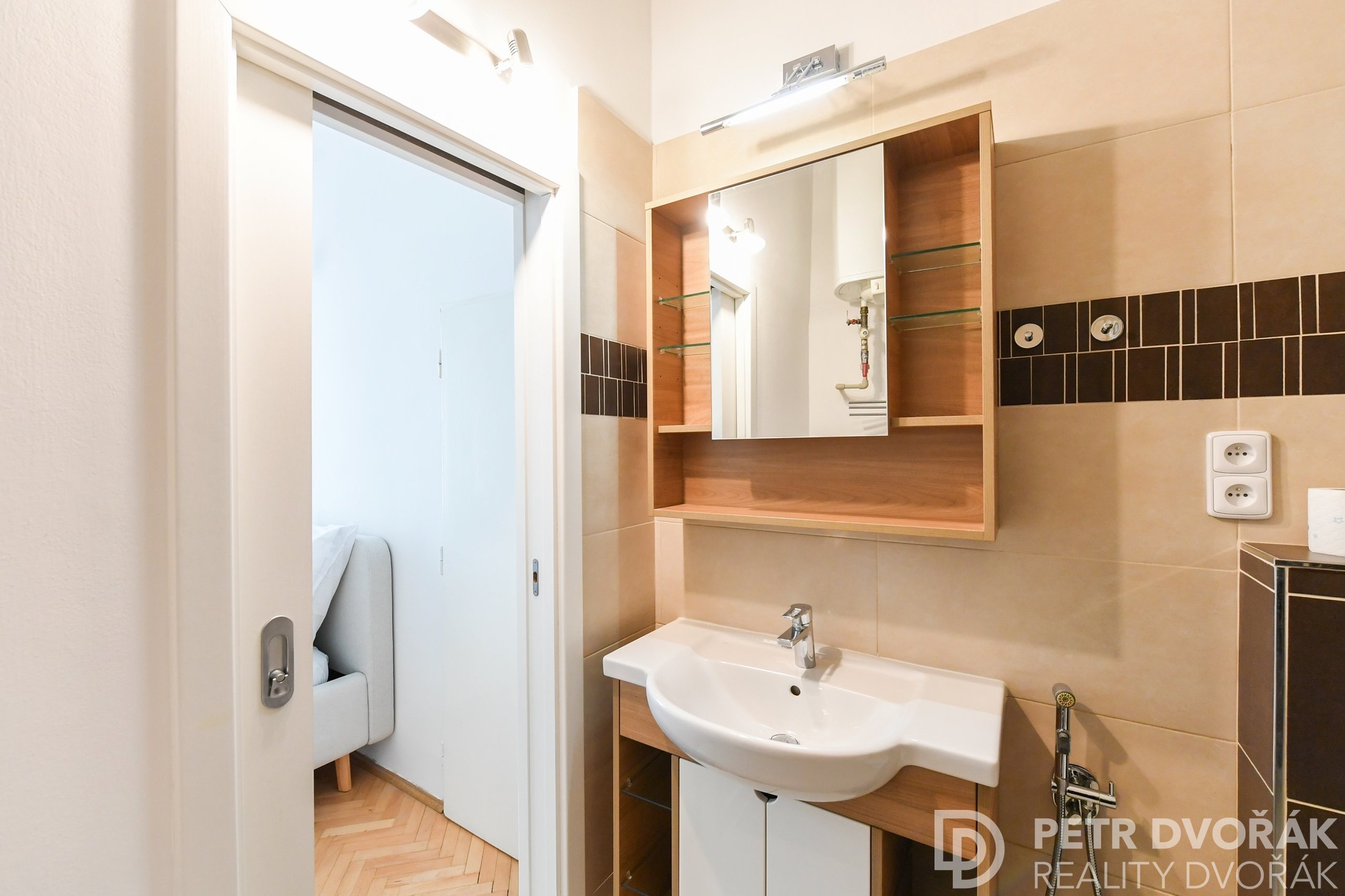Z obývacího pokoje do ložnice – stejná kastlová okna, stejný dialog s ulicí. Přilehlá koupelna se sprchovým koutem, toaletou a pračkou. V suterénu sklepní kóje 1,5 m².