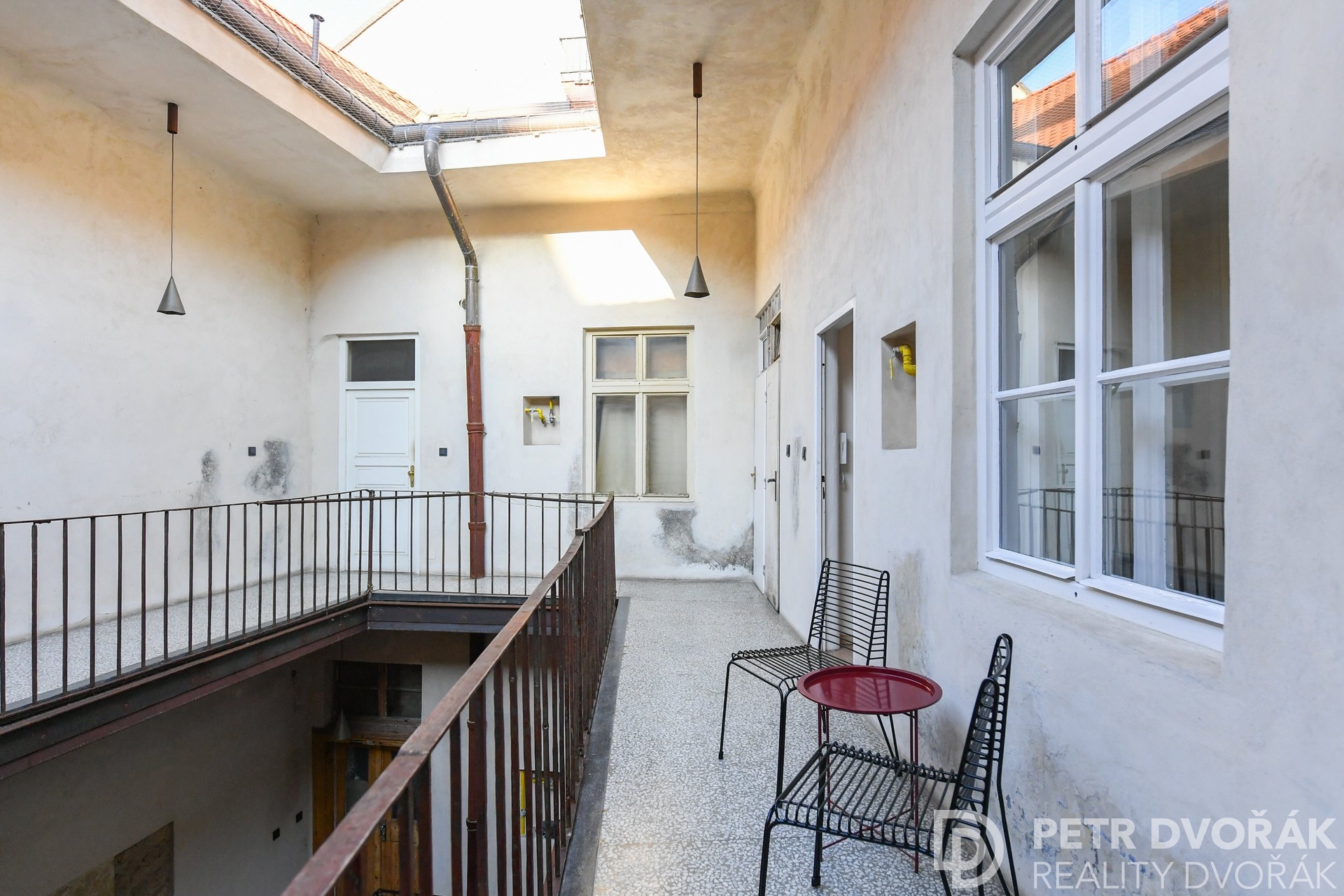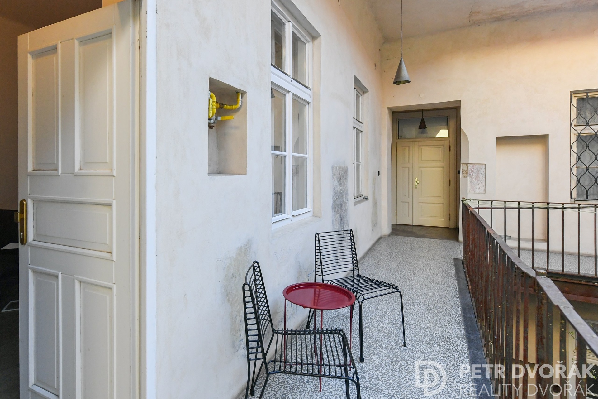 Než vkročíte do bytu, zastavíte se tady. Stolek, dvě křesílka, výhled do dvora. Ranní káva nebo večerní víno – venku, a přitom soukromě. Nikdo sem nevidí.