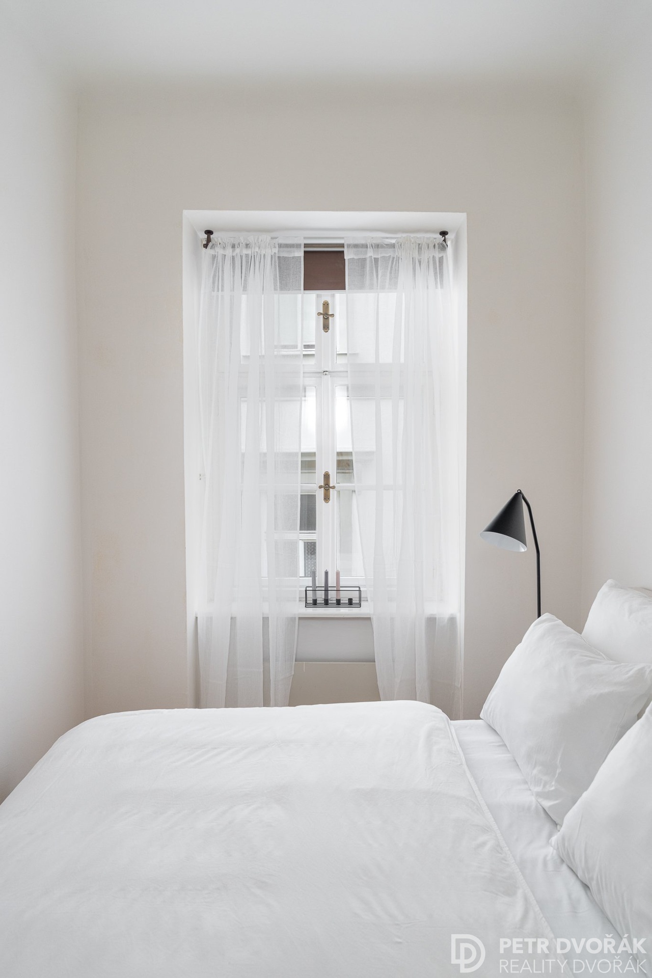 Z obývacího pokoje do ložnice – stejná kastlová okna, stejný dialog s ulicí. Přilehlá koupelna se sprchovým koutem, toaletou a pračkou. V suterénu sklepní kóje 1,5 m².