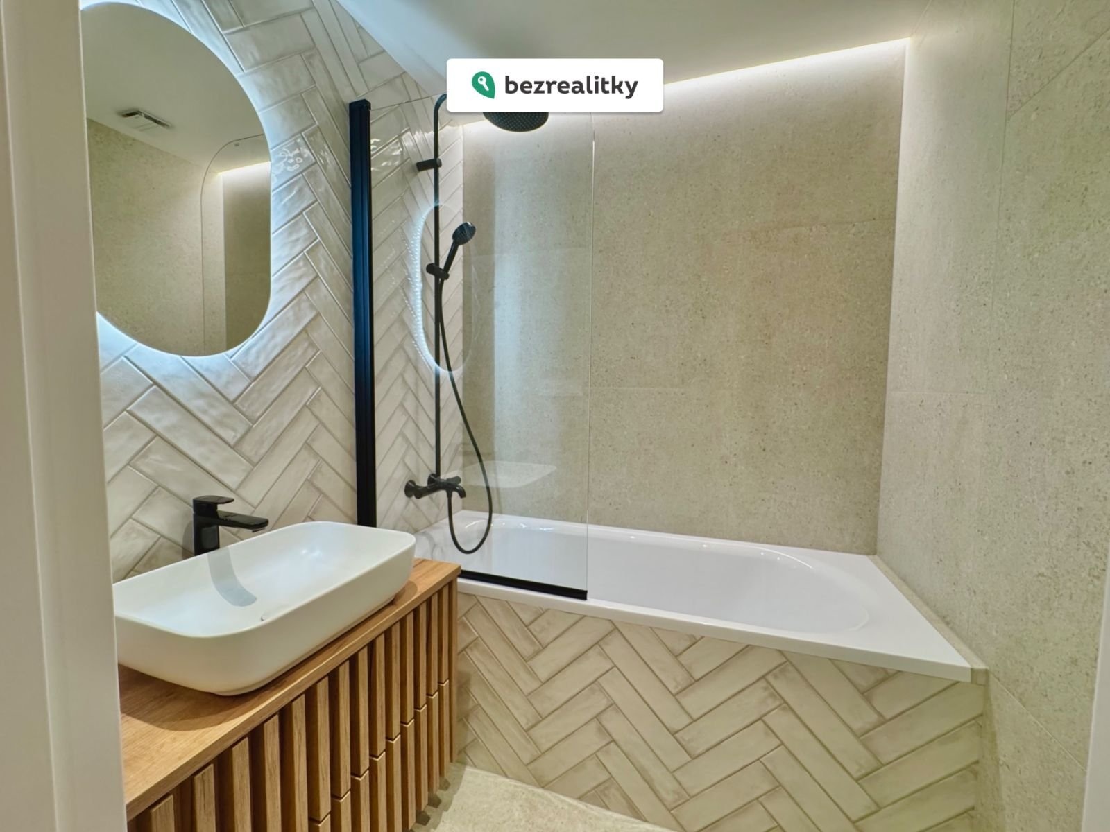 • Koupelna je řešena v moderním stylu a vybavena sanitou značky Hansgrohe a nechybi taky Italske obklady