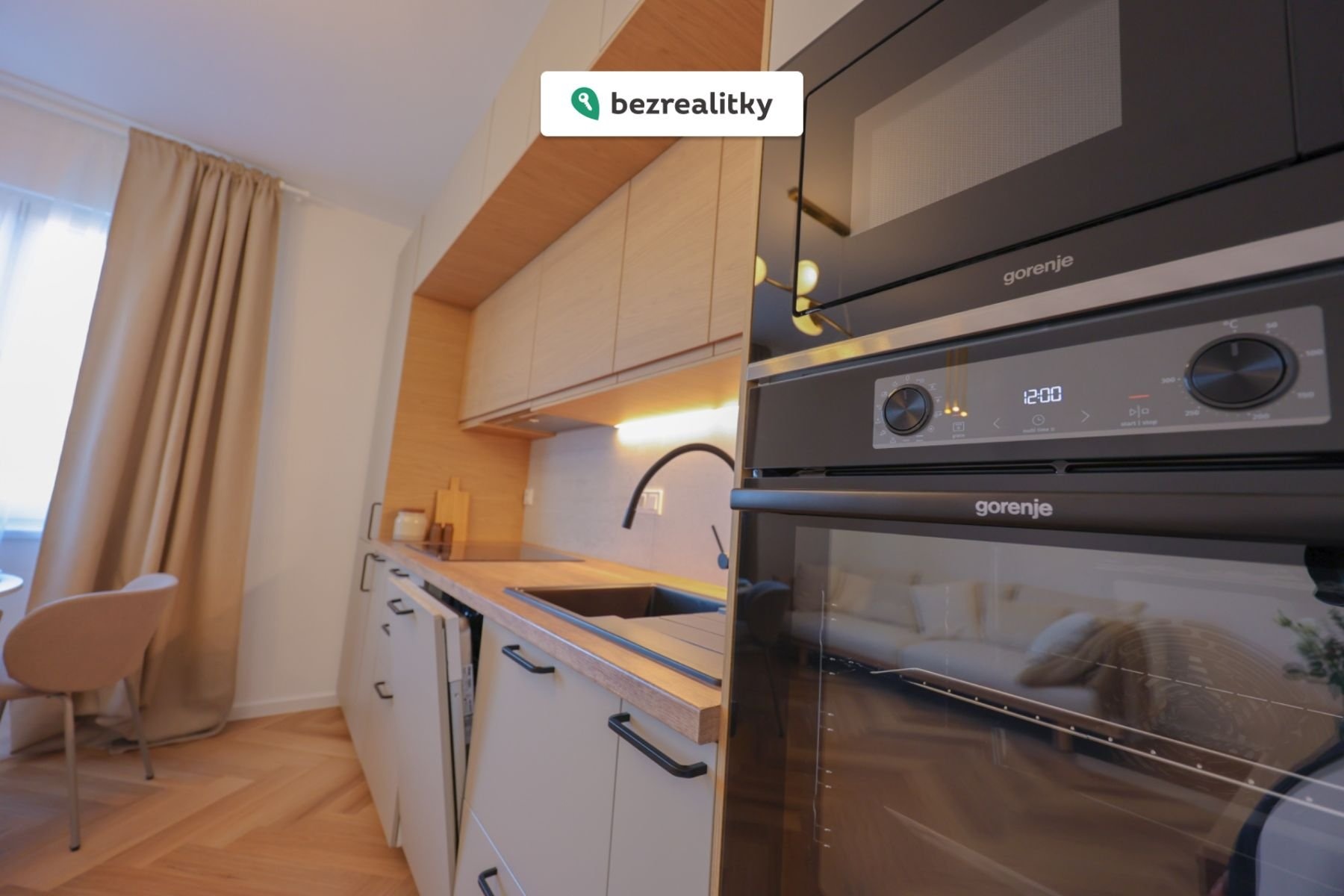 Součástí bytu je také moderní kuchyňská linka vybavená vestavěnými spotřebiči značky Gorenje.
