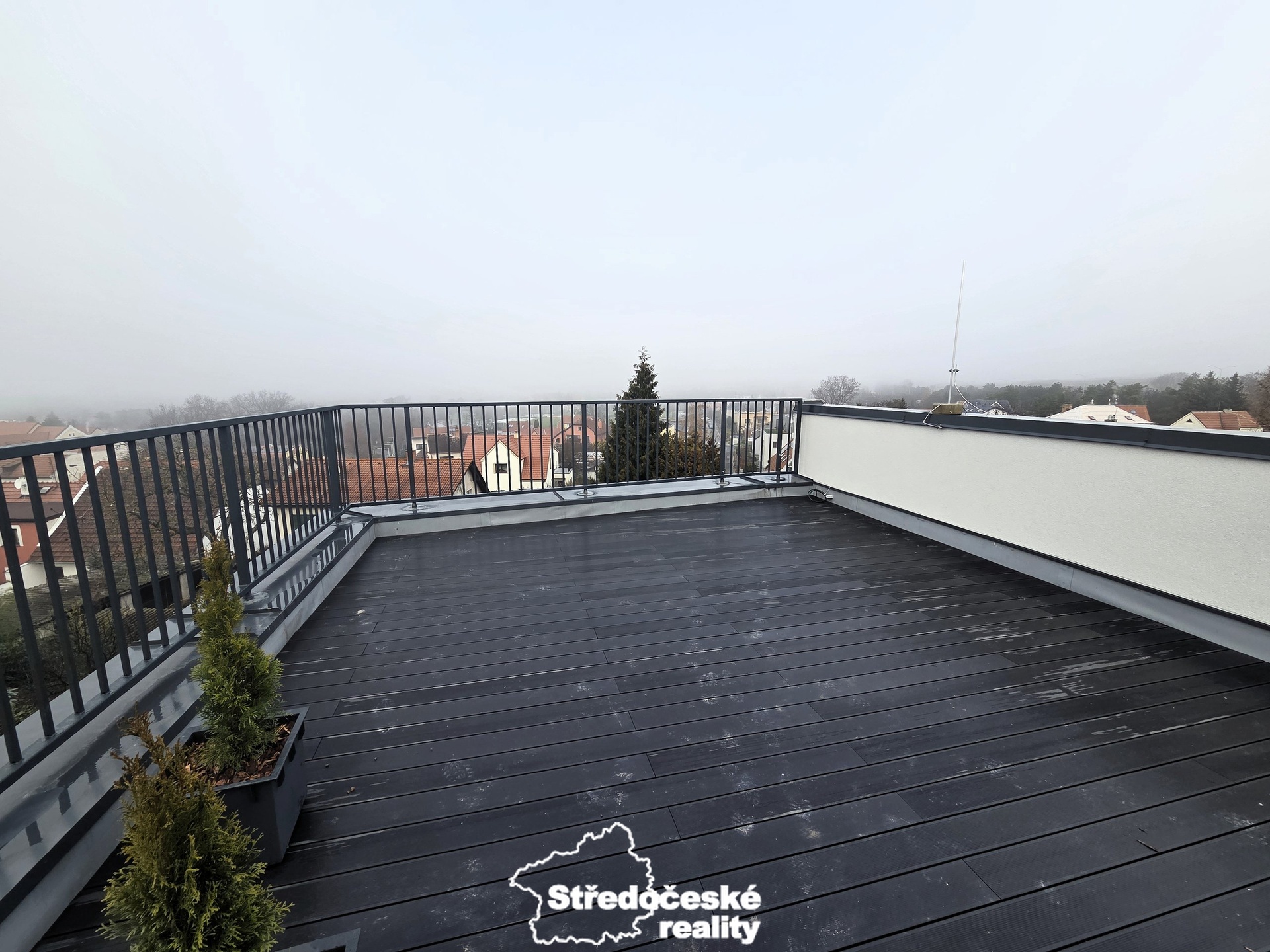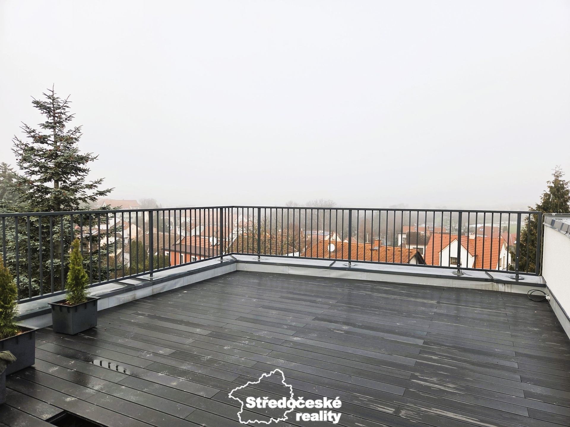 K příslušenství patří 30ti metrová střešní terasa přímo nad bytem s otevřeným výhledem nad ostatní domy. Terasa má přívod vody a elektřiny a je určena pro Vaši pohodu při relaxu, odpočinku a grilování. V ceně je dále zahrnuto garážové stání a sklepní kóje. Tento byt je opravdu jedinečný.