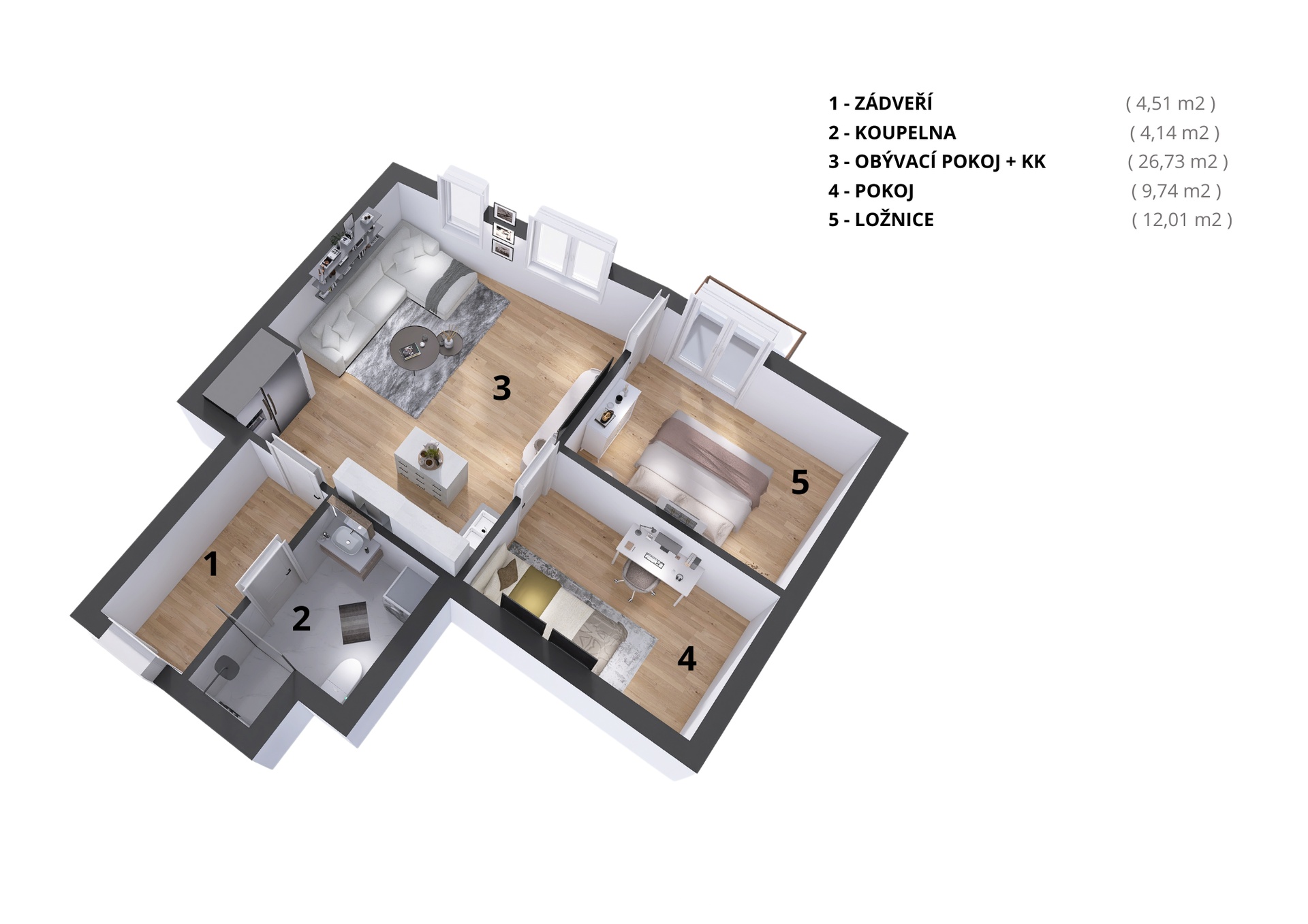 Byt je kdykoliv k vidění a je k nastěhování na konci ledna 2026. Ve standardu jsou použity kvalitní materiály, dřevěné podlahy, hliníková okna s trojskly, individuální rekuperace vzduchu, venkovní bezpečnostní rolety na elektřinu a další.