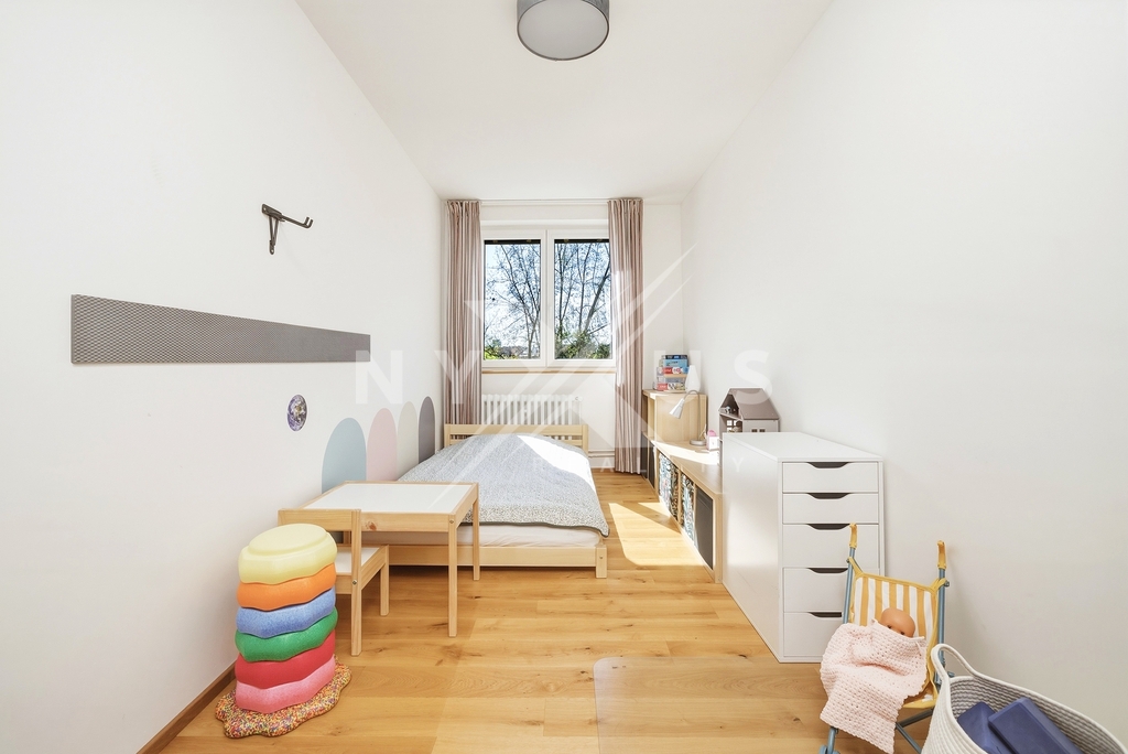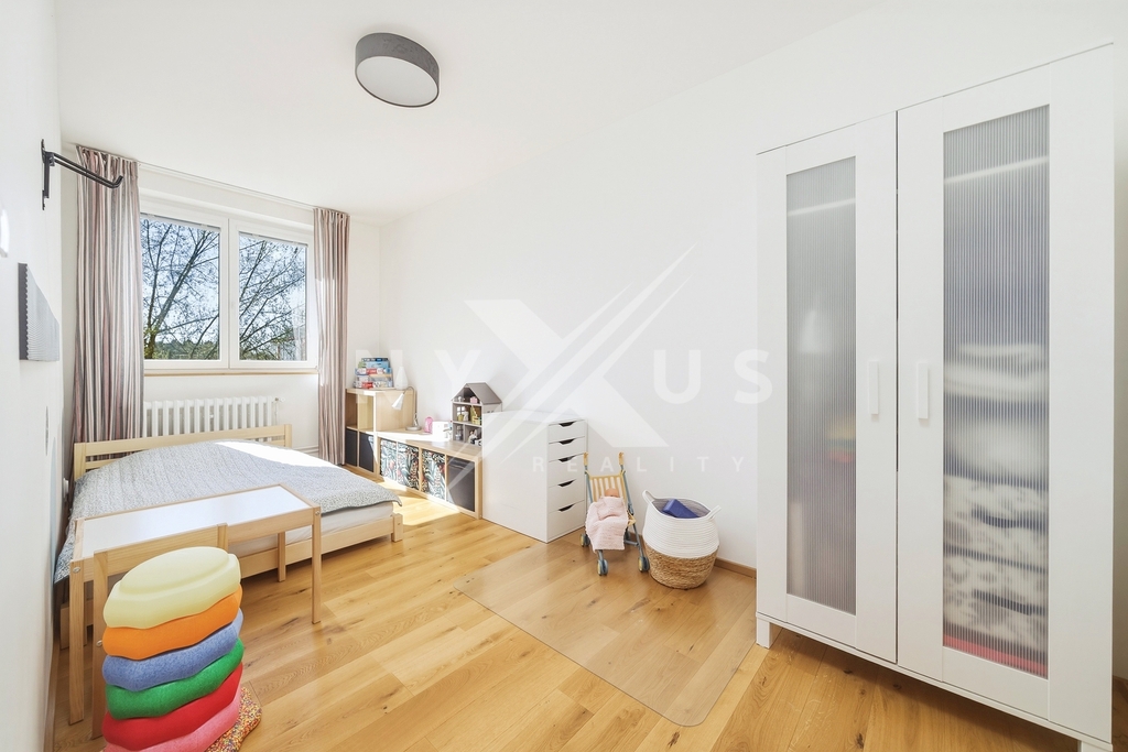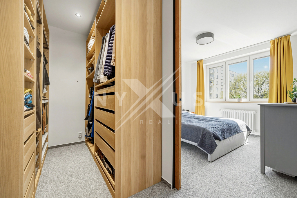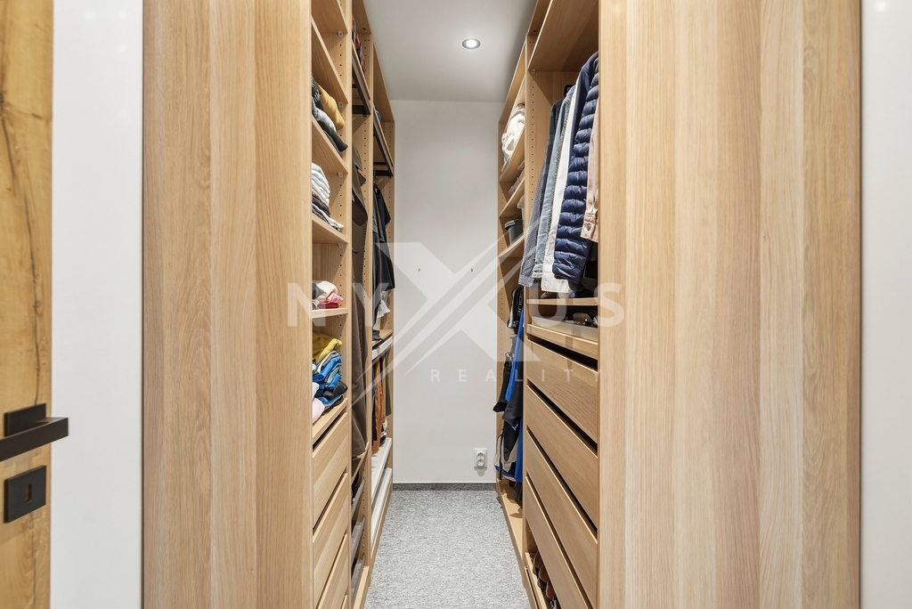 Praktickým benefitem jsou neprůchozí pokoje, dostatek denního světla díky orientaci na jih a jihozápad i promyšlené úložné zázemí v podobě šatny a vestavěných skříní.