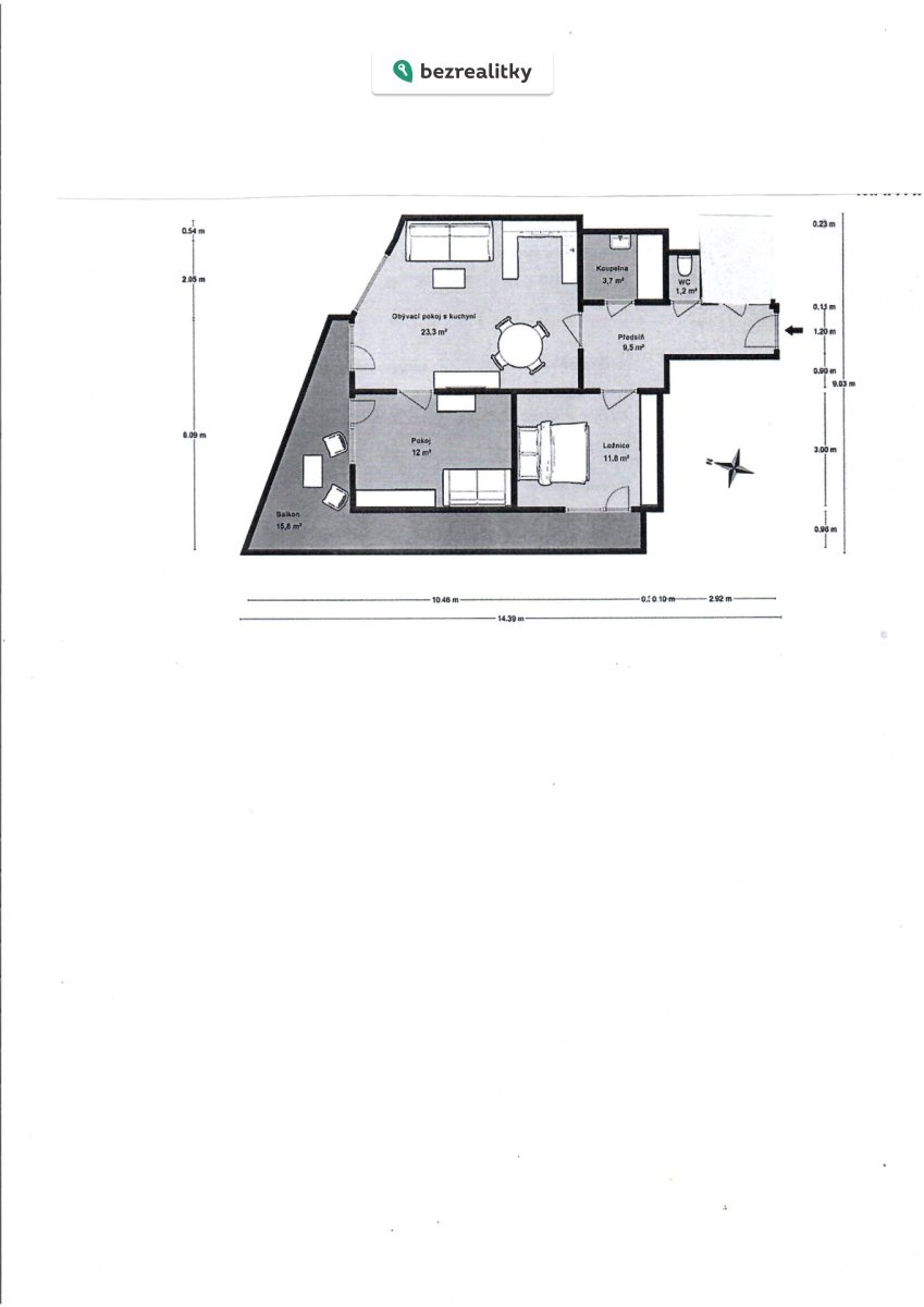 Předsíň 9,6 m2, koupelna 3,7 m2, obývací pokoj+kk 23,4 m2, 2x pokoj po 12,10 m2, WC 1,2 m2, terasa 1...17,5 m2, terasa 2...16,4m 2, zahrádka 32,4 m2, sklep 2,3 m2.