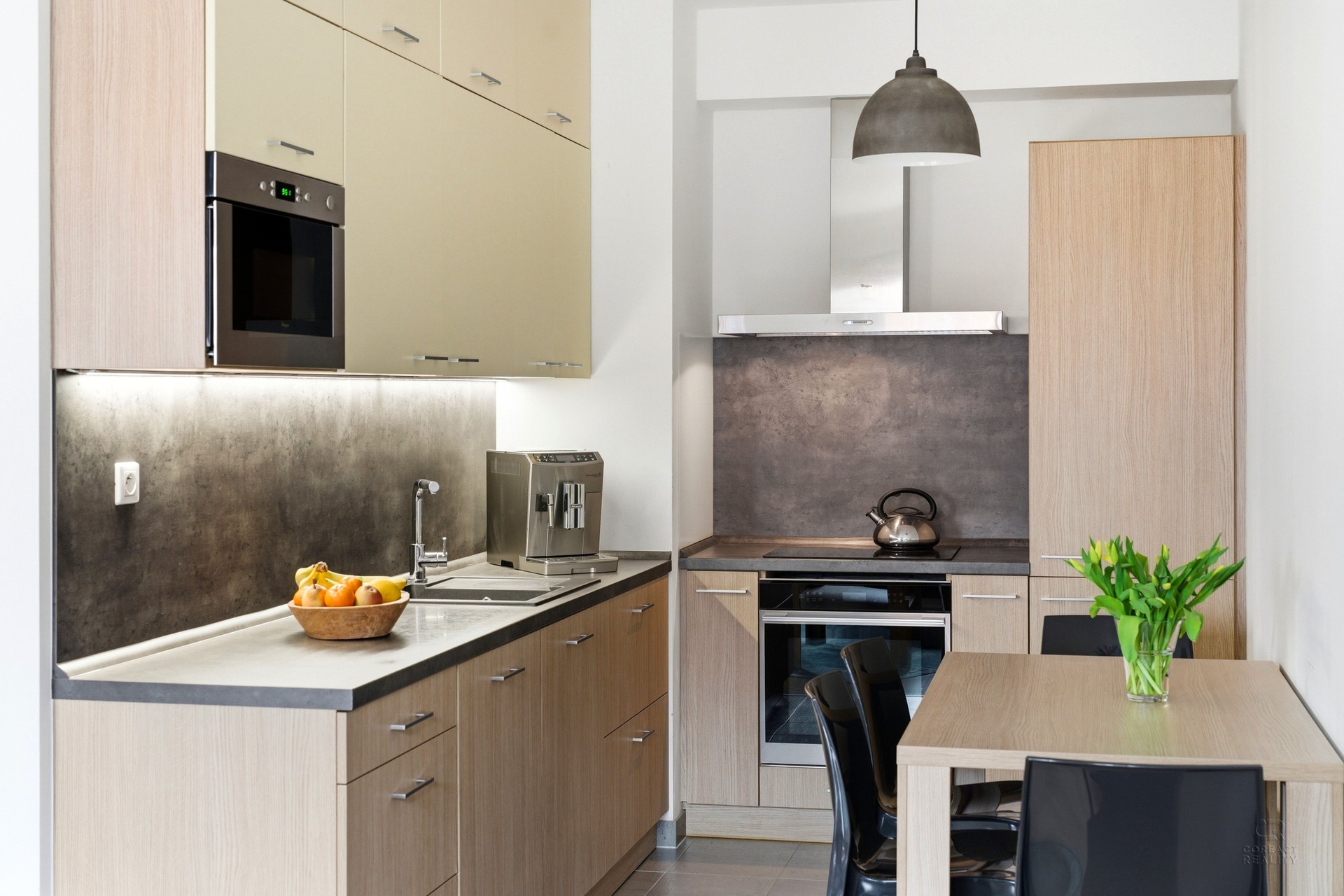 Díky dobré orientaci je byt příjemně prosvětlený po celý den. Kuchyňský kout je vybaven základními spotřebiči a poskytuje dostatek prostoru pro vaření i stolování. Obývací část navazuje na kuchyni a tvoří příjemné centrum bytu. Ložnice jsou