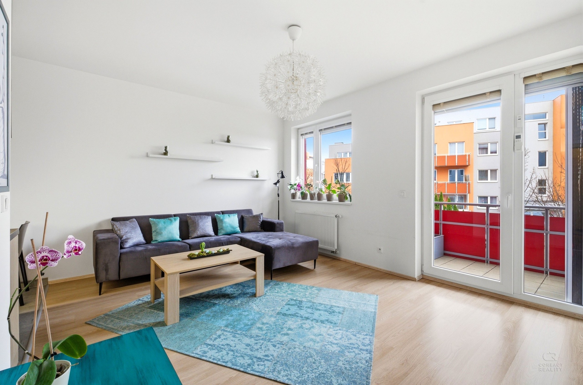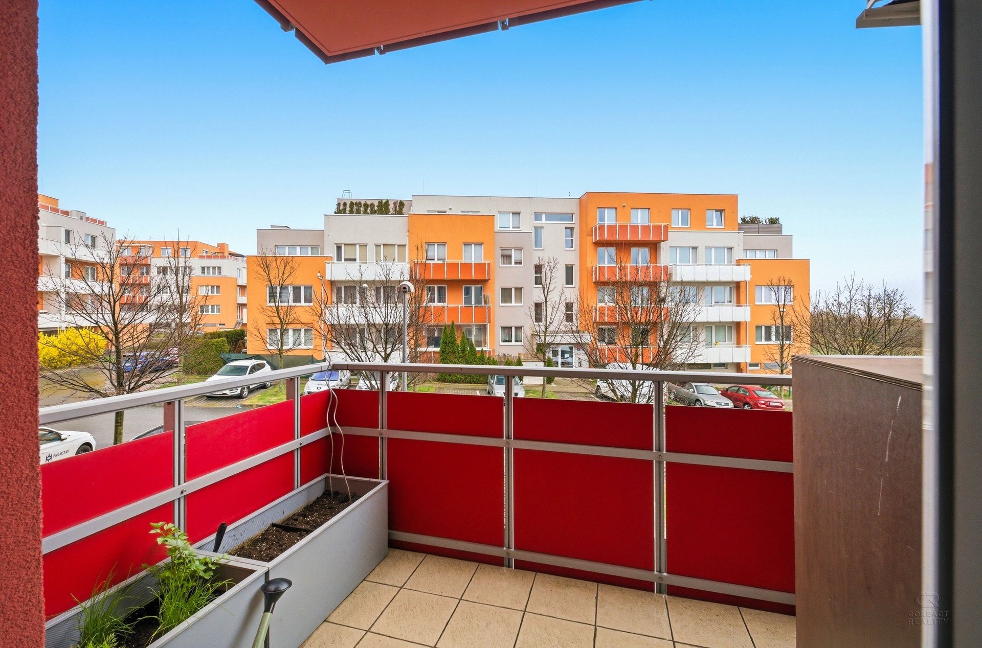 kuchyňským koutem, dvě samostatné ložnice, koupelnu a oddělené WC. Navíc každá místnost je klimatizovaná a okna bytu jsou opatřena před okenními stahovacími roletami. K bytu náleží lodžie a balkon o výměře 11.8m2, dále vnitřní parkovací místo a sklep (3.2m2)