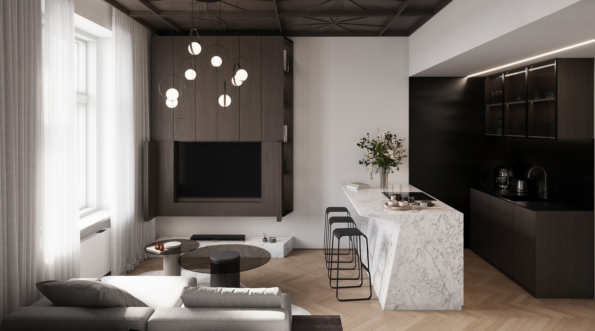 Půdorys bytu ve 4. podlaží zahrnuje obývací pokoj s přípravou na kuchyni, ložnici, vstupní chodbu, koupelnu a toaletu. K jednotce náleží také balkon a sklepní kóje. Vybavení zahrnuje dubové podlahy, dřevěná špaletová okna s dvojsklem, elegantní interiérové dveře, koupelnu s mramorovými obklady se sanitou značek Laufen a Grohe a decentně řešená otopná tělesa a elektroinstalaci, která neruší celkový výraz interiéru. Byt bude dokončen v provedení fit out – připravený k okamžitému nastěhování.