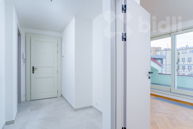 Interiér o podlahové ploše 75,1 m² doplňuje terasa o velikosti 6,7 m². Dominantou bytu je prostorný obývací pokoj s přípravou na kuchyňský kout, který je díky velkoformátovému posuvnému oknu (HS portál) nadstandardně prosvětlený. Z terasy se nabízí unikátní výhled na kostel a Žižkovskou věž.