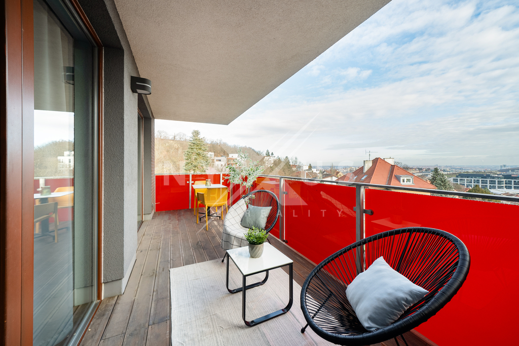 Moderní, velmi světlý byt 3+kk o ploše 81 m² s terasou 12 m² a vlastní dvojgaráží se nachází ve 3. nadzemním podlaží energeticky úsporného domu v klidné a vyhledávané lokalitě Na Pomezí, Praha – Jinonice.