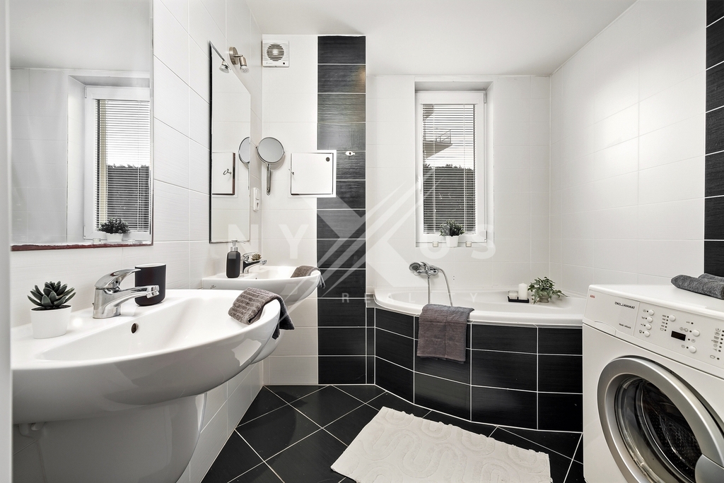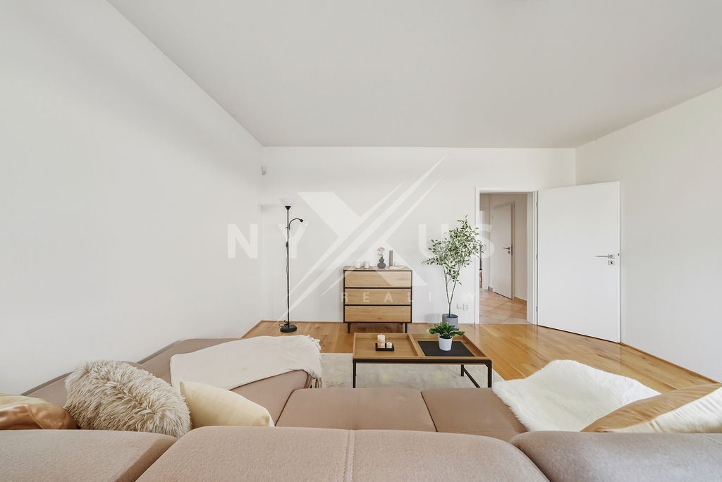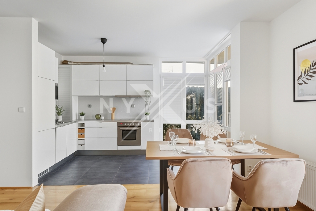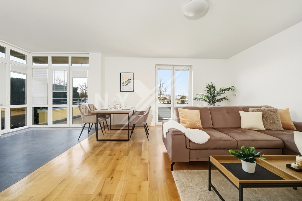 Dominantou bytu je velkorysý obývací pokoj s kuchyňským koutem o rozloze 36,1 m², vybavený francouzskými okny orientovanými na západ, díky nimž je interiér po celý den krásně prosvětlený a plynule propojený s terasou.