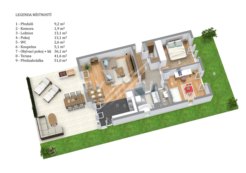 ložnice 13,1 m² (se vstupem přímo na předzahrádku 51 m²)