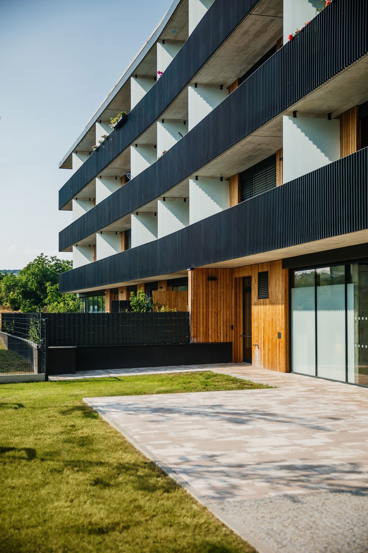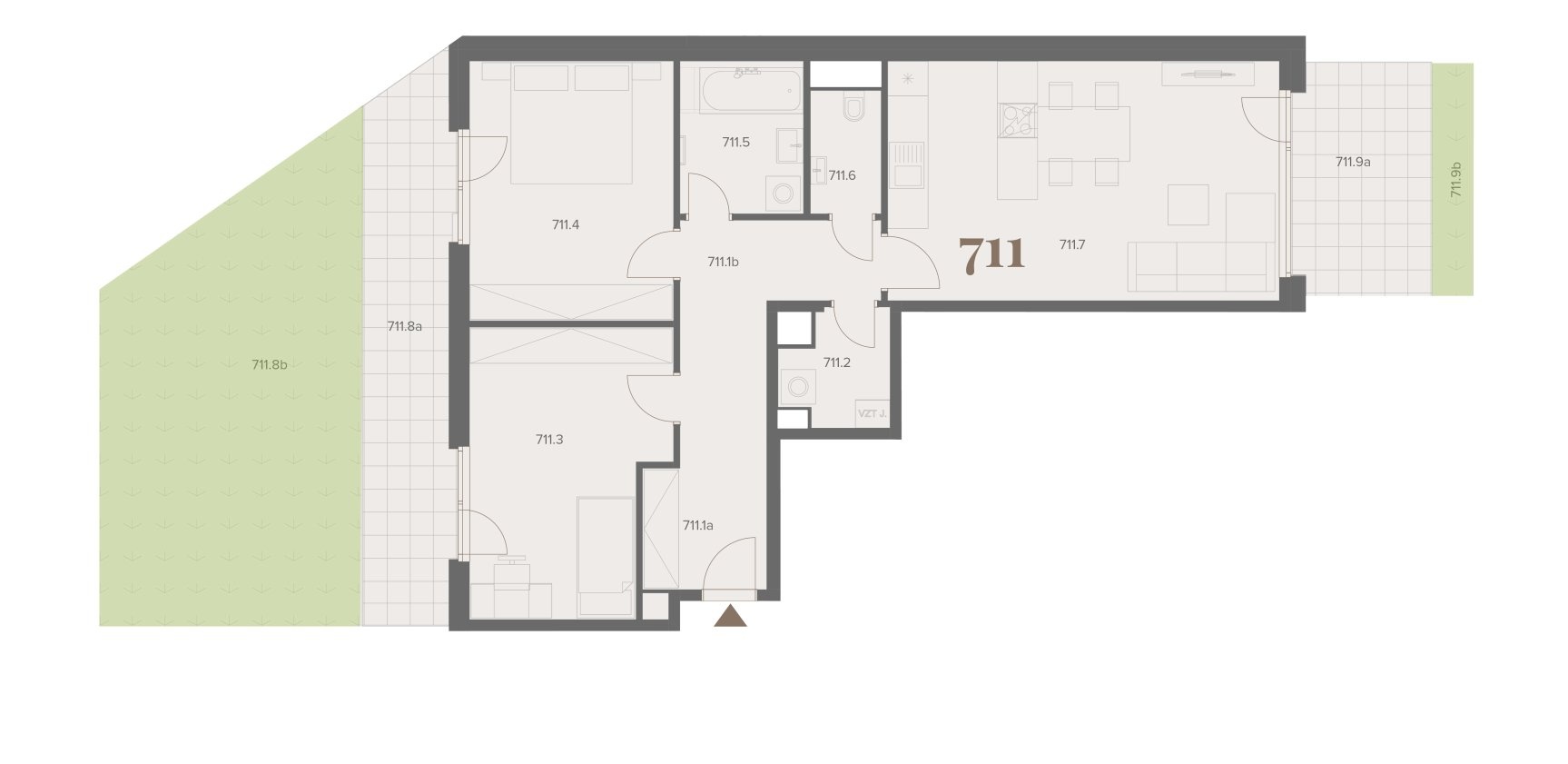 Byt splňuje všechny parametry chytrého a energeticky úsporného bydlení – je vybaven rekuperací, podlahovým vytápěním, izolačními trojskly a inteligentní řízení domácnosti. Dispozice zahrnuje světlý obývací pokoj s moderní kuchyní a přímým vstupem na zatravněnou terasu, dva samostatné pokoje orientované do tichého vnitrobloku, koupelnu, samostatné WC a také praktickou komoru. Terasy poskytují dostatek soukromí a příjemný prostor pro odpočinek či rodinné posezení.