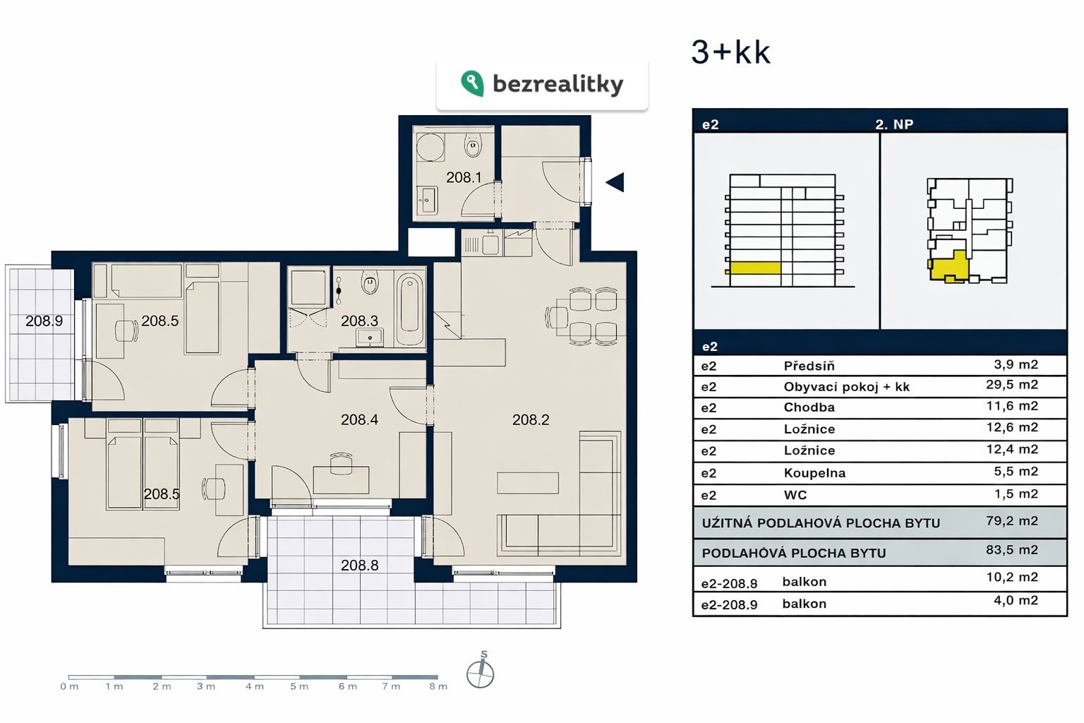 Velmi světlý a dispozičně skvěle řebyt 3+kk, s podlahovou plochou 83,5 m2 plus dva balkony 14 m2 (10 m2 a 4 m2), sklepem 5m2 a parkovacím stáním v garáži v 1. podzemním podlaží. Byt je umístěný ve 2.NP posledního domu rezidenčního projektu "Tulipa Třebešín", na pomezí pražských Strašnic a Žižkova, v blízkosti několika parků a v pěším dosahu metra Želivského. Dům byl zkolaudován v roce 2018 a vzhledem ke své krajní poloze nabízí dostatek soukromí. Dispozici bytu tvoří předsíň, komora s toaletou, obývací pokoj s kuchyňským koutem, dvě ložnice, prostorná chodba (možno využít též jako pracovnu) koupelna s vanou, sprchovým koutem a toaletou. Větší balkon je přístupný z obývacího pokoje a z jedné ložnice a směřuje na jih. Menší balkon je přístupný z druhé ložnice a má západní orientaci.