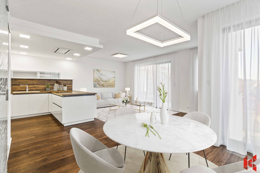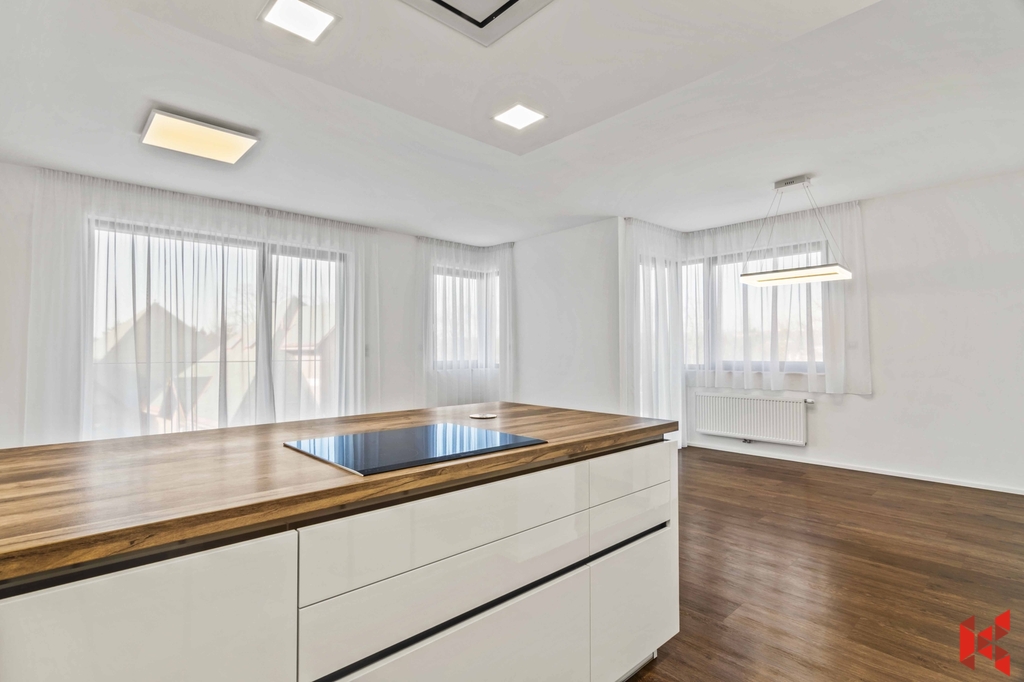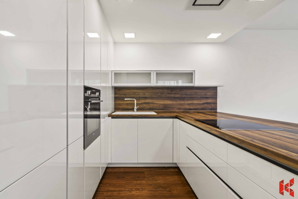 ✔ Prakticky umístěná a plně vybavená kuchyň mimo obývací pokoj, přesto propojená