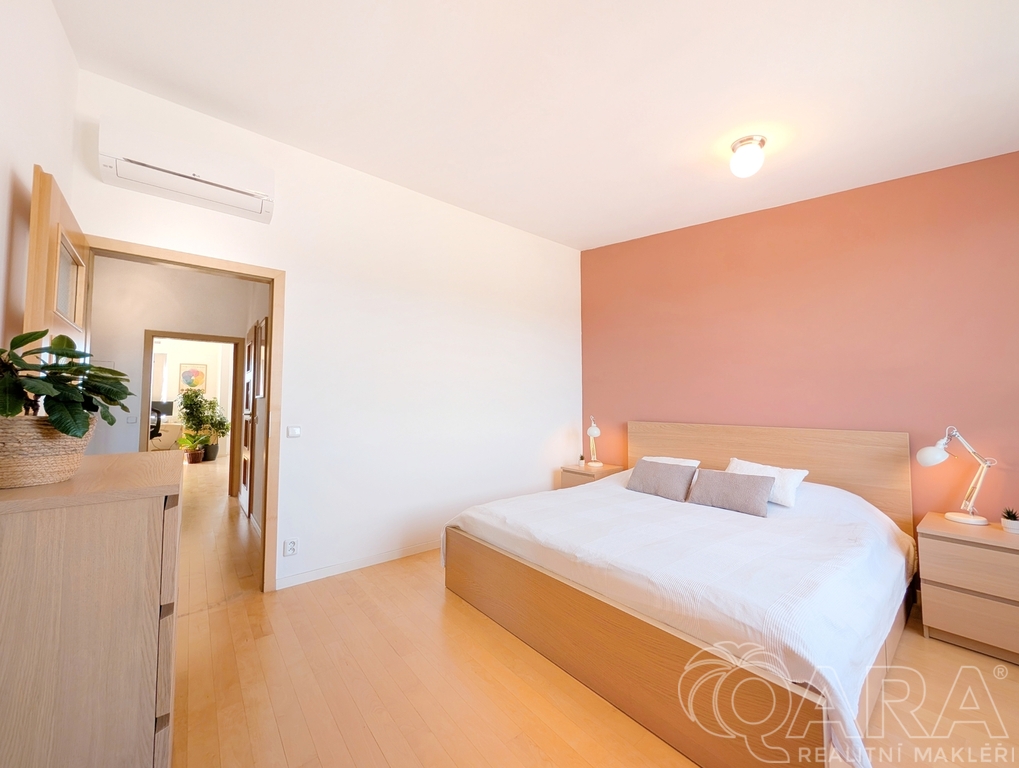 Velkým benefitem bytu je balkon s krásnými výhledy z nejvyššího patra. Komfort bydlení zvyšují také tři klimatizační jednotky s možností chlazení i vytápění, ovládané přes mobilní aplikaci. Vytápění je řešeno dálkově.