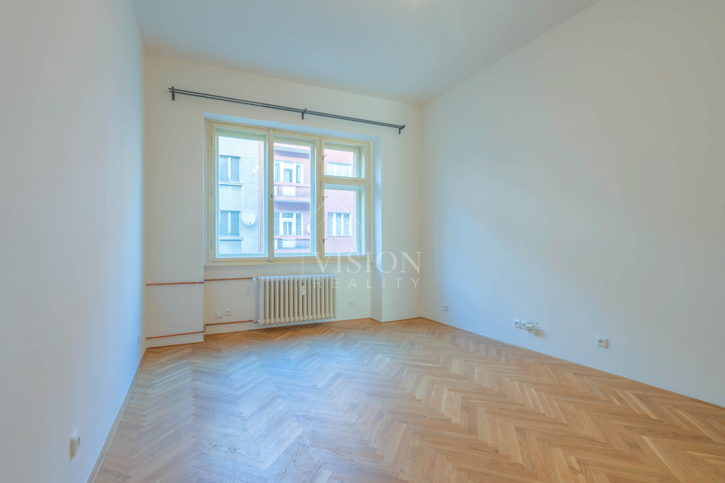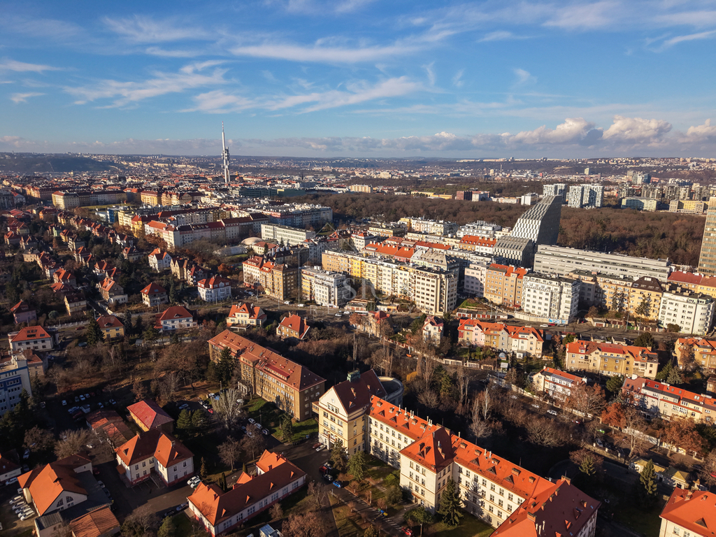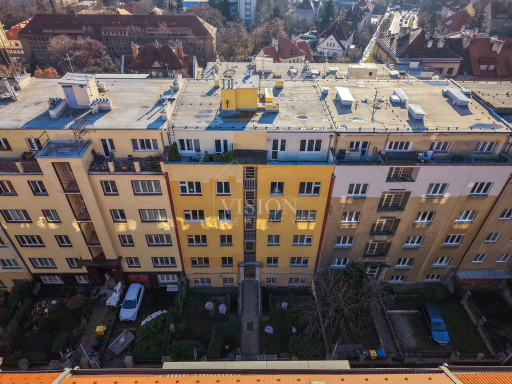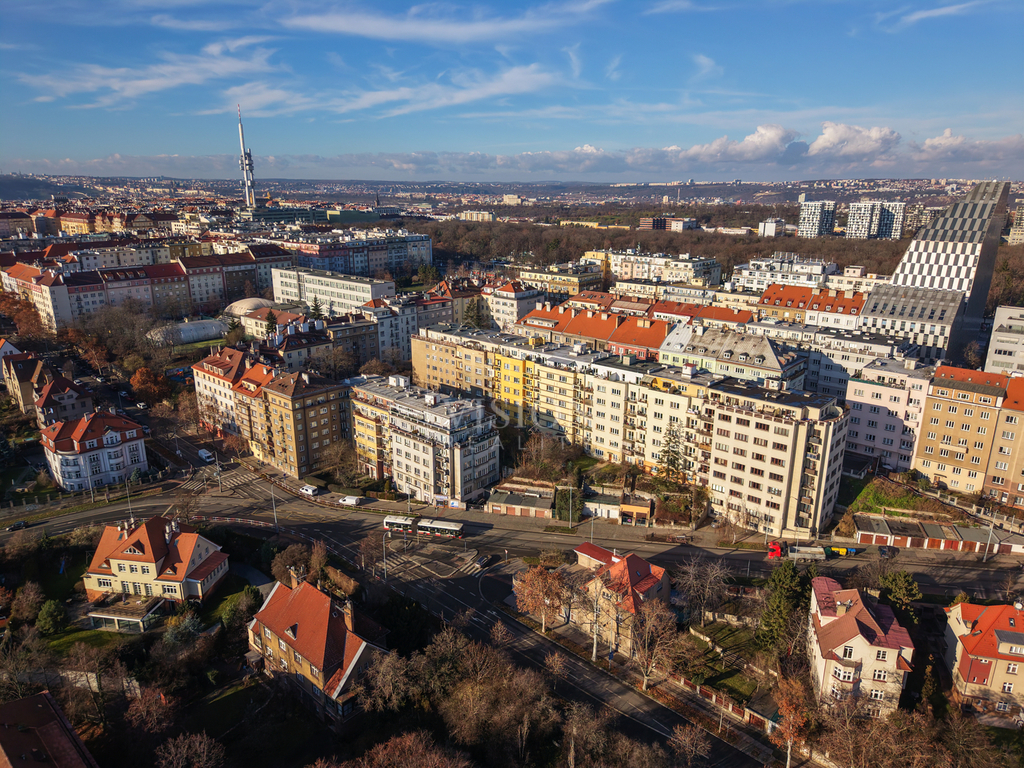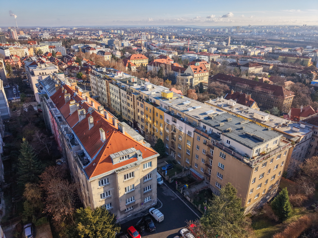 Dispozice bytu je velmi funkční – všechny tři obytné místnosti jsou samostatně přístupné a neprůchozí. Dva pokoje směřují na sever do tiché ulice, zatímco obývací pokoj s kuchyňským koutem je orientovaný na jih a má přímý vstup na balkón s otevřeným výhledem na panorama Prahy.