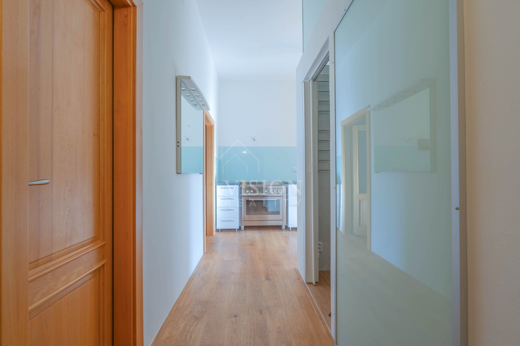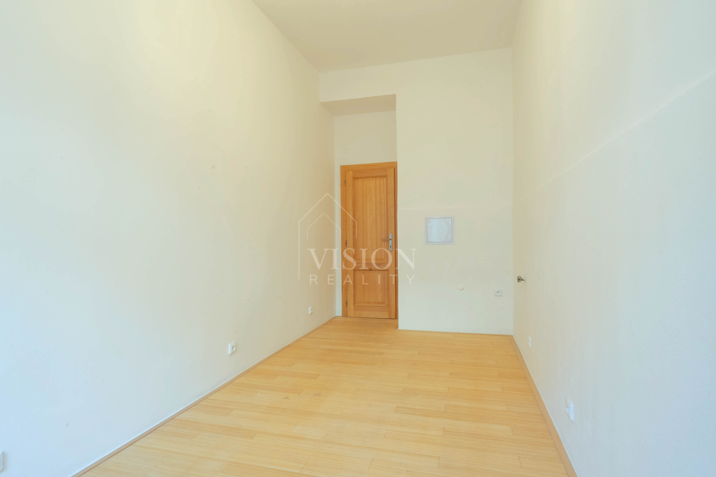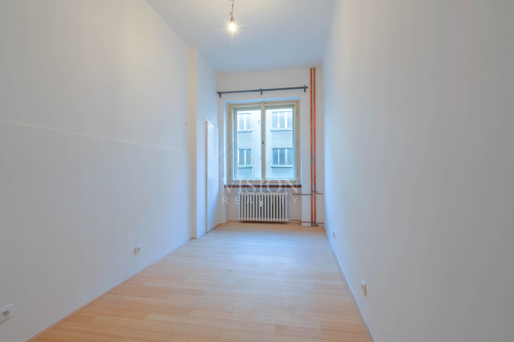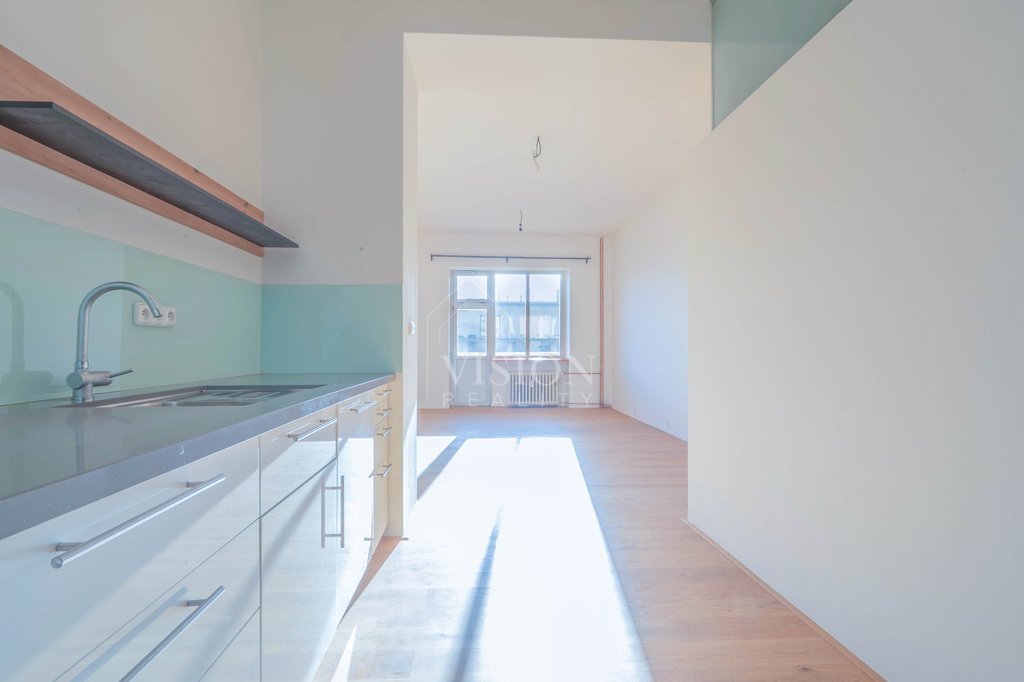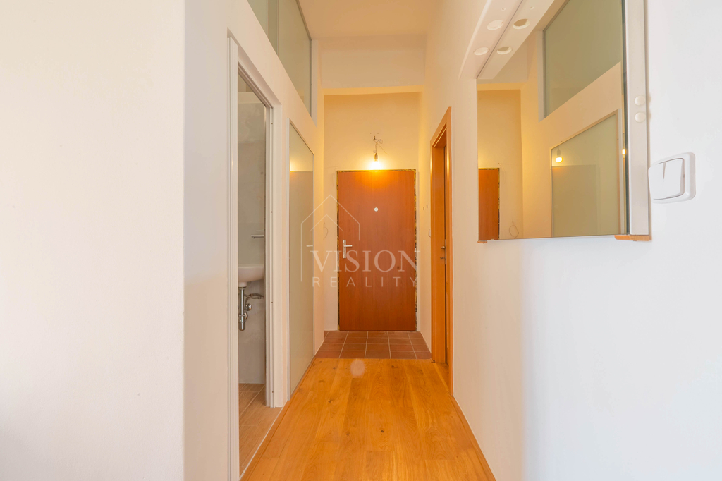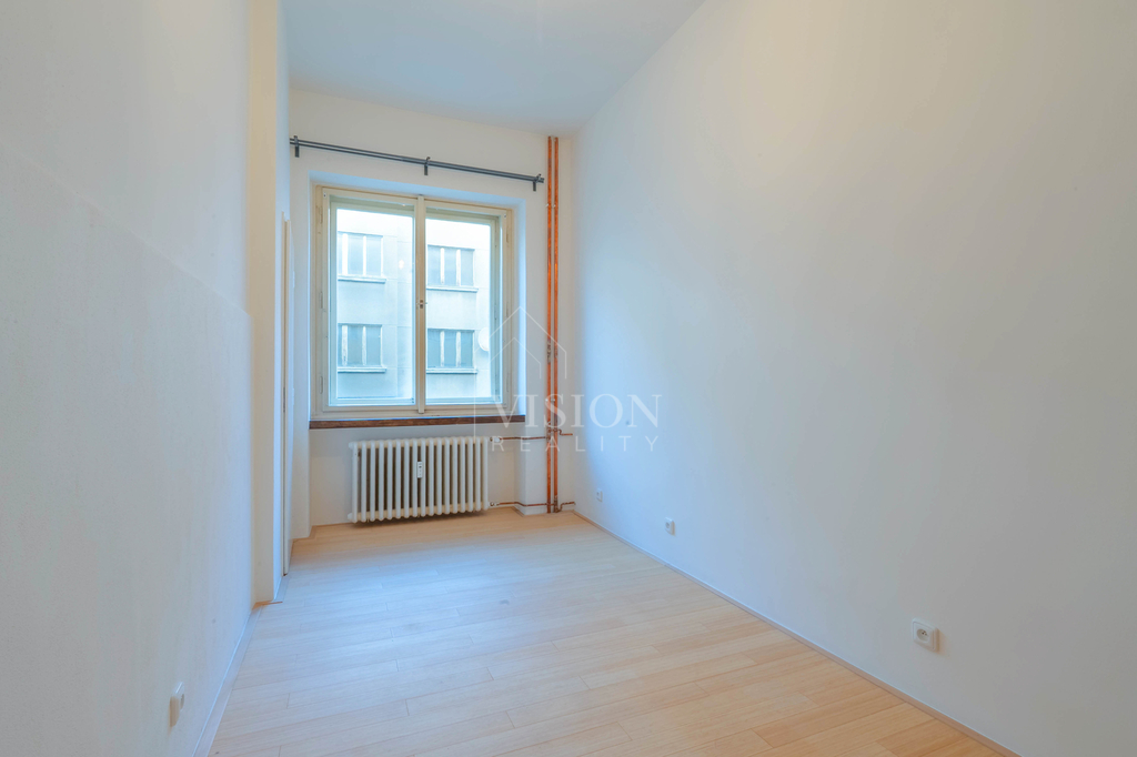 Dispozice bytu je velmi funkční – všechny tři obytné místnosti jsou samostatně přístupné a neprůchozí. Dva pokoje směřují na sever do tiché ulice, zatímco obývací pokoj s kuchyňským koutem je orientovaný na jih a má přímý vstup na balkón s otevřeným výhledem na panorama Prahy.