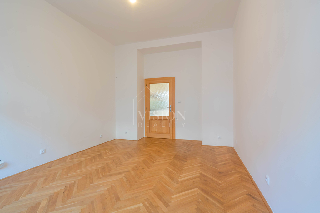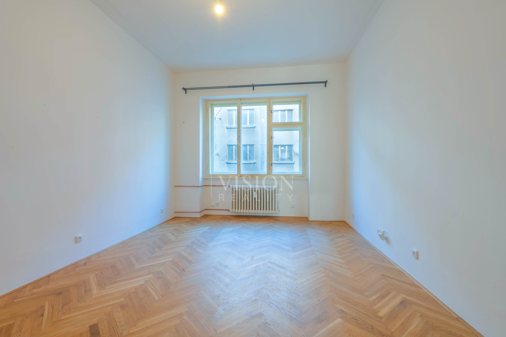 Interiér bytu prošel kvalitní rekonstrukcí a nabízí kombinaci moderních prvků a nadčasových materiálů. Podlahy tvoří masivní dřevěné parkety, dubová prkna a vrstvený bambus. Koupelna je vybavena velkoformátovou keramikou, prostorným sprchovým koutem, dvěma umyvadly, dvěma WC a bidetovou sprškou. Přirozené denní světlo v koupelně je zajištěno architektonicky řešeným prosklením. Součástí bytu je také odvětrávaná spíž.