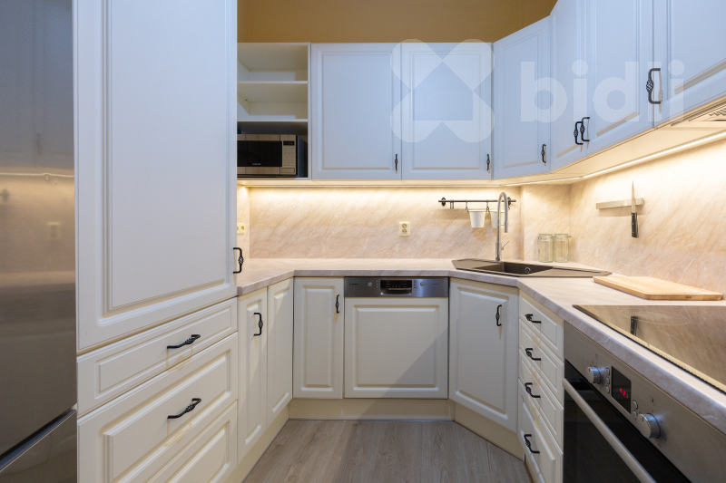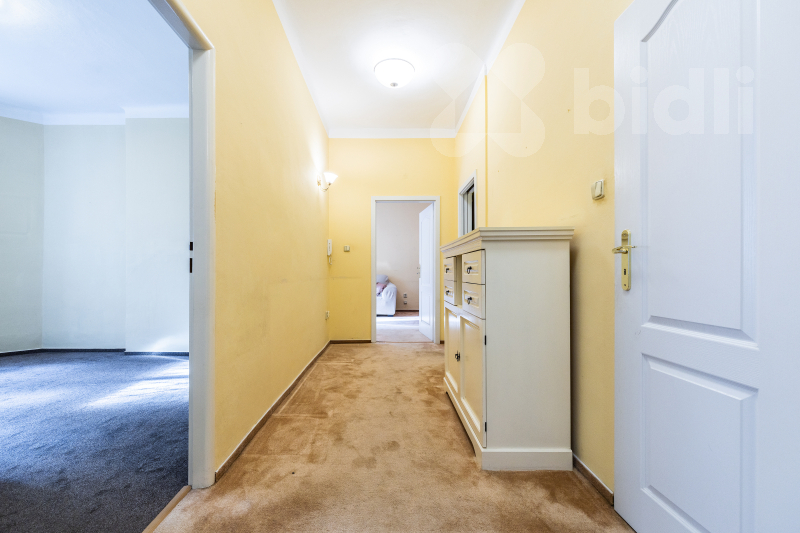Dispozice bytové jednotky sestává z ložnice, obývacího pokoje se vstupem na balkon, samostatného kuchyňského koutu, dalších dvou pokojů, 2x koupelny s vanou a sprchovým koutem, samostatné toalety, prostorné chodby, kuchyňského koutu, nadstandardní spíže, technické místnosti s přípojkou na pračku. Podlahy tvoří původní téměř sto let staré dřevěné parkety, které prošly moderní renovací, doplněné o koberce a dlažbu.