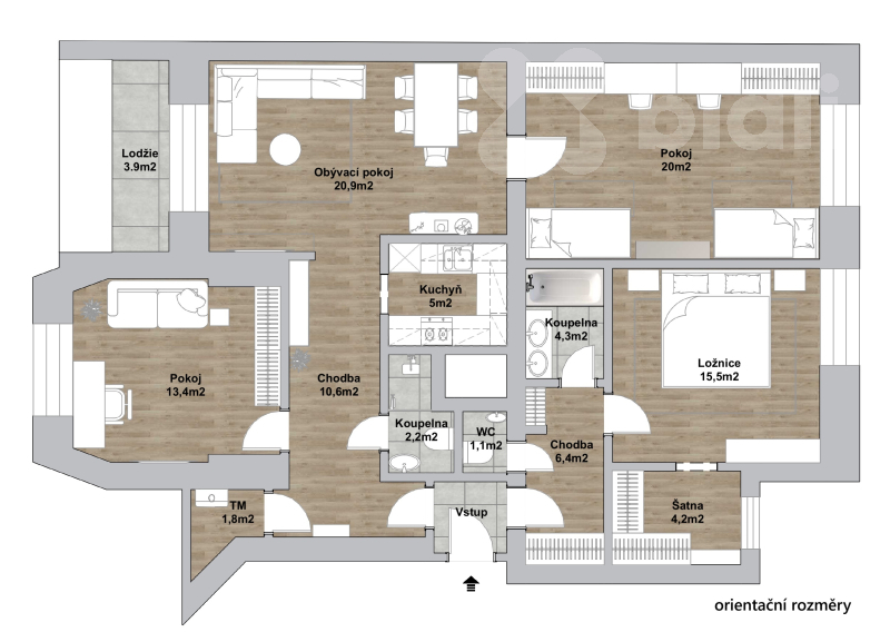 Byt nabízí zajímavou možnost dispoziční úpravy - díky dvěma samostatným vstupům z chodby lze prostor oficiálně rozdělit na dvě menší bytové jednotky. Tento koncept otevírá široké možnosti využití: