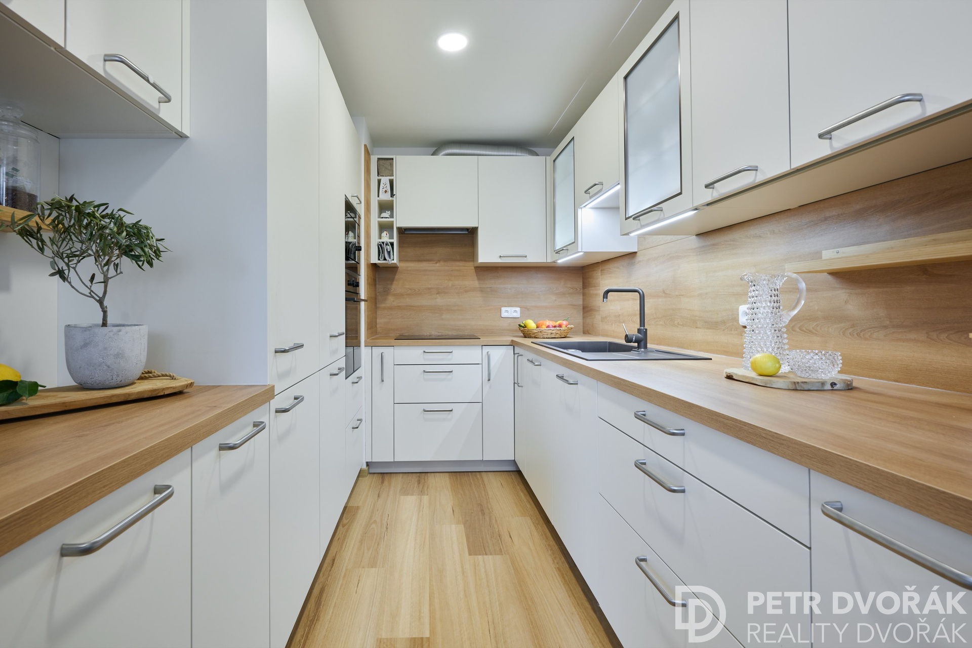 Byt prošel v roce 2024 kompletní rekonstrukcí odbornou firmou — nové rozvody elektřiny a vody, radiátory, podlahy včetně podkladů, kuchyňská linka i spotřebiče. Trojskla jsou vybavena elektricky ovládanými roletami na dálkové ovládání. Akusticky upravené stěny a stropy zajišťují skutečný klid v každé části bytu. Interiér dokreslují dveře z dubové dýhy sladěné s podlahou.