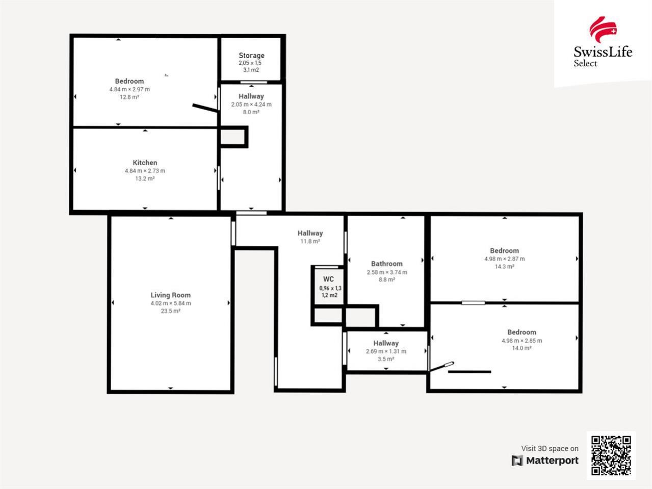 Bezvadná dispozice bytu poskytuje velkorysou předsíň s možností mnohých úložných prostor, a ta byt dělí na dvě části. Jedna část má výhledy na západ a nachází se zde 3 místnosti: prostorný obývací pokoj, kuchyň s jídelním koutem a samostatná ložnice. Ve východní části jsou pak další dva pokoje/ložnice, přičemž jeden je průchozí. Byt disponuje dvěma toaletami jedna samostatná a jedna v rámci koupelny, kde je dále jak vana, tak sprchový kout. A jako velký bonus je přímo v bytě také objemná komora, přes 3 m2.