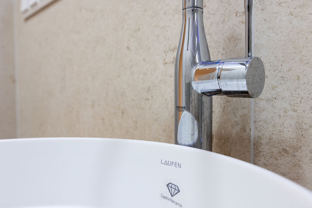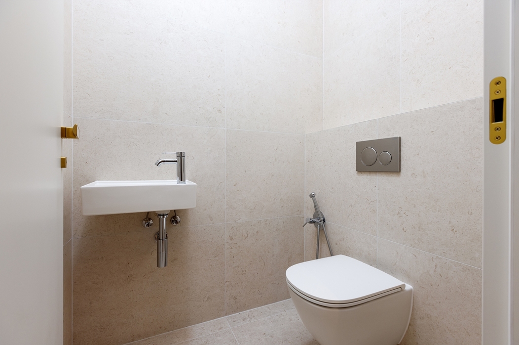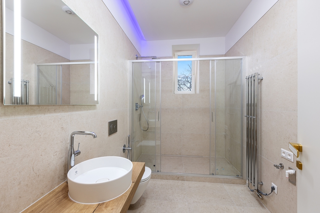 V bytě se jsou dvě toalety, jedna z nich je samostatná a jedna součástí prostorné koupelny se sprchovým koutem s oknem. Samozřejmostí je zde použita kvalitní sanita Grohe včetně podomítkového sprchové tělesa.