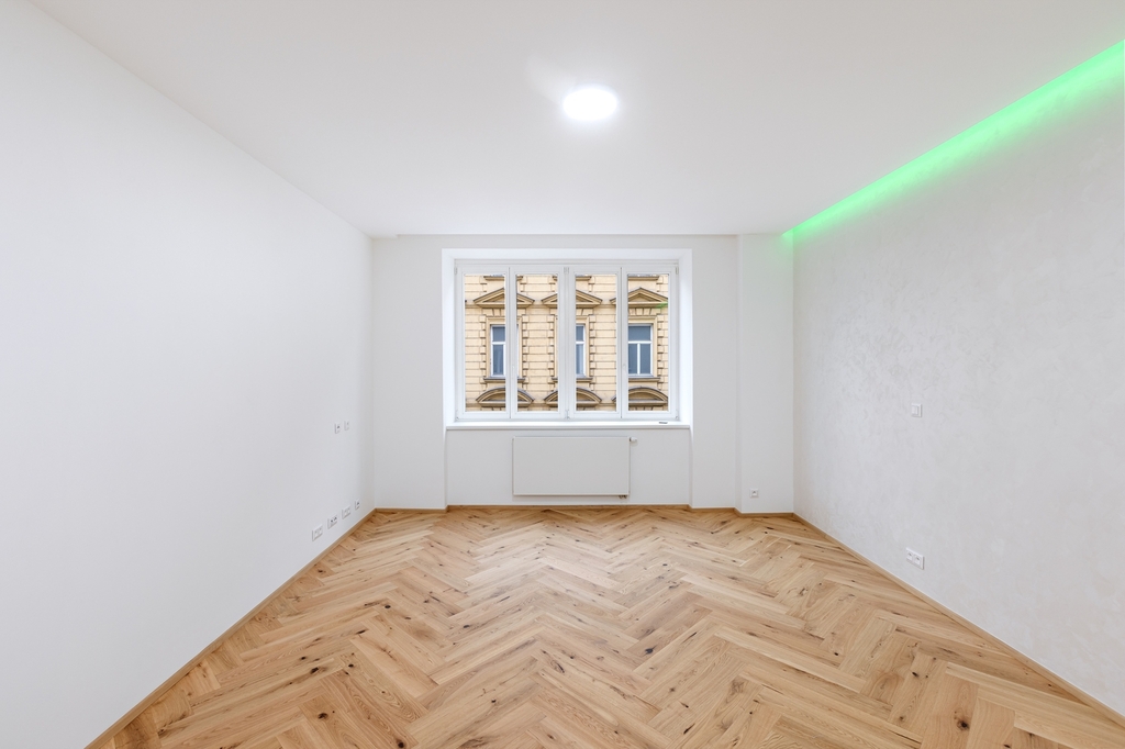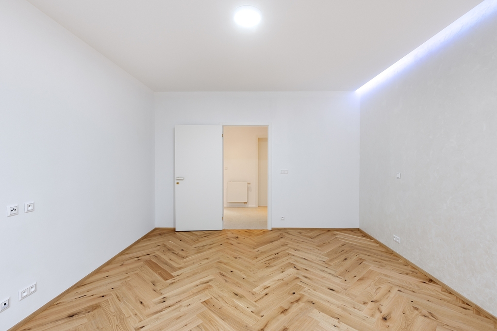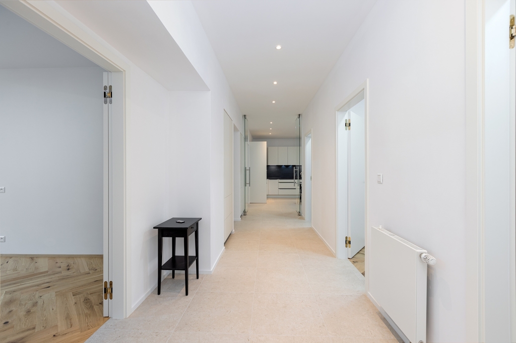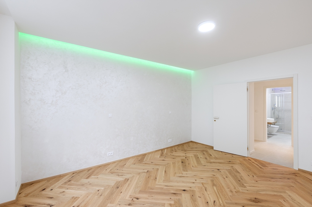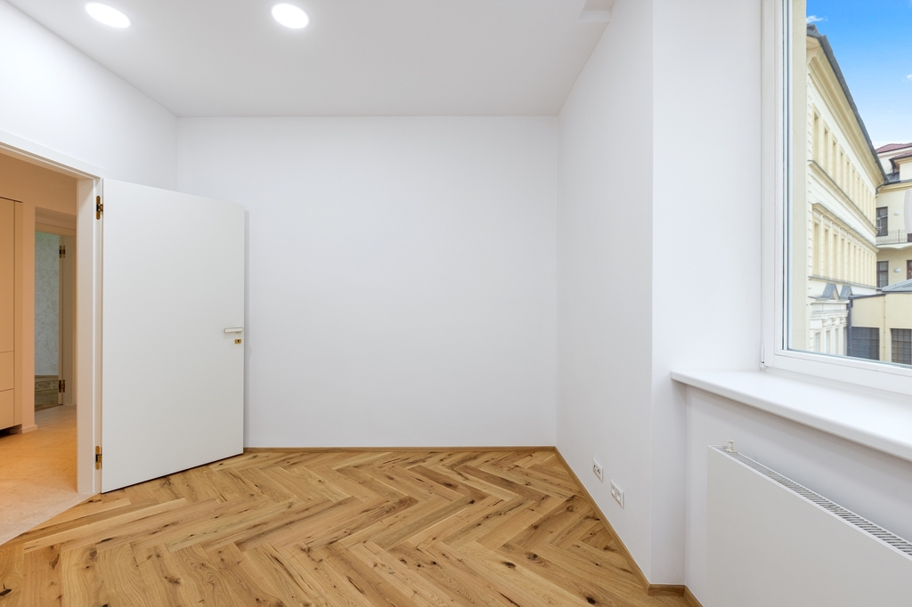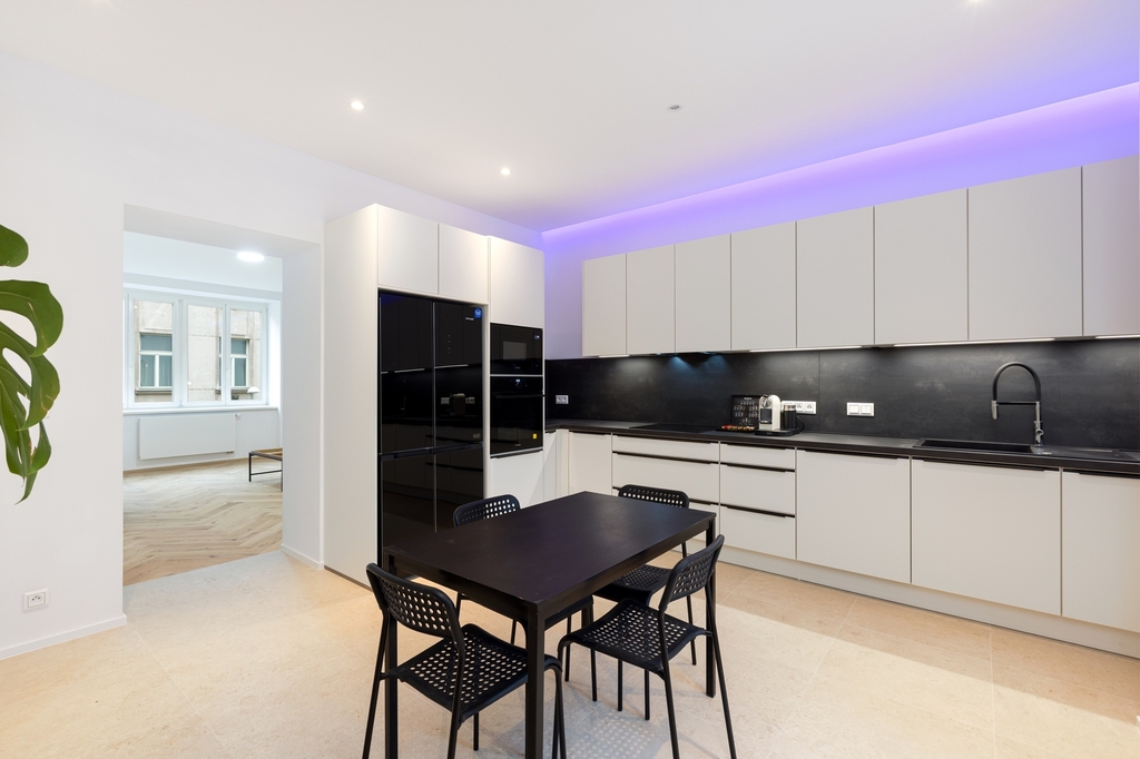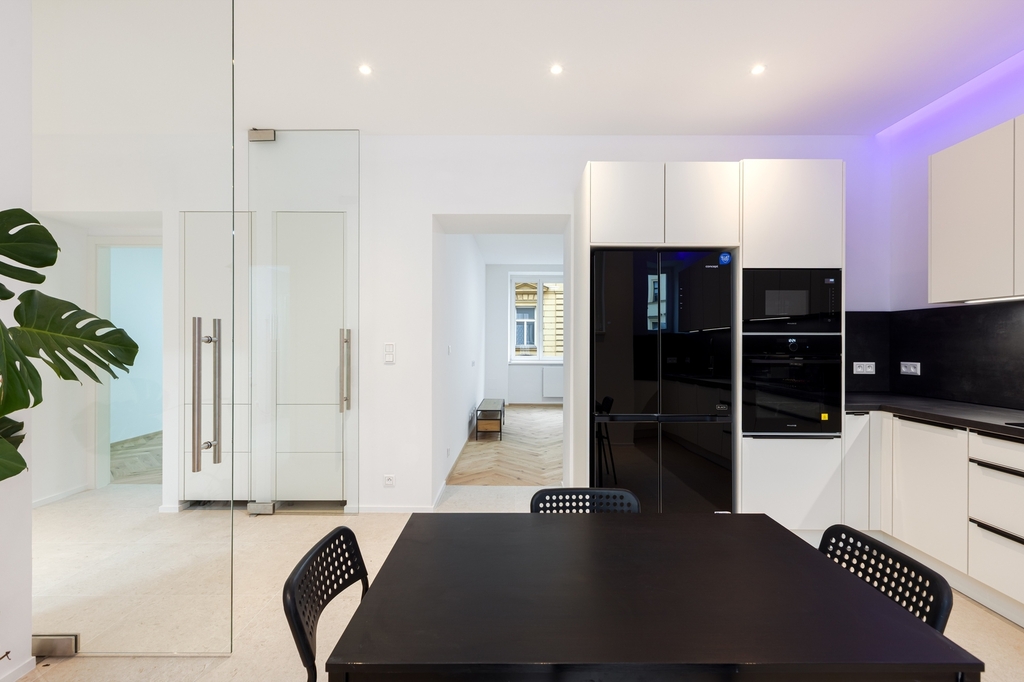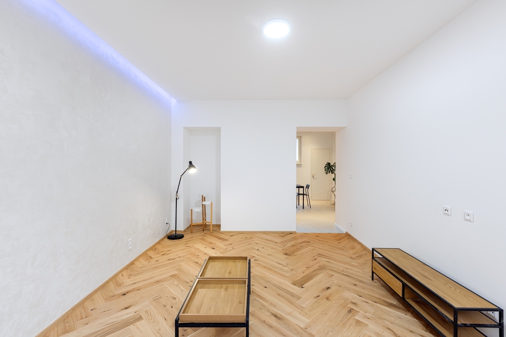 Každý pokoj je vybaven masivní lakovanou nově položenou dvouvrstvou dřevěnou podlahou, velkoformátovou dlažbou a obklady spojuje chodba, toaleta, koupelna a kuchyň aby vynikl prostor jako celek. Vzdušnost bytu zajišťují vysoké stropy, v každém pokoji včetně koupelny a kuchyně je barevné ambientní osvětlení.