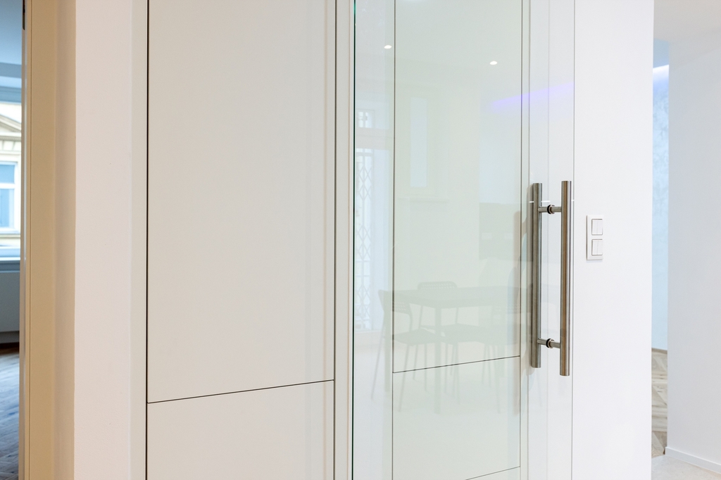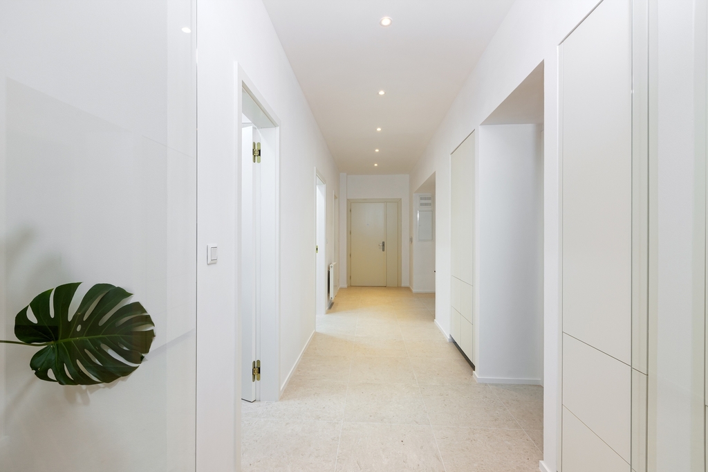 Při vstupu do bytu masivními bezpečnostními dveřmi se otevře prostorná vstupní hala. Na konci haly jsou prosklené dveře do kuchyně.