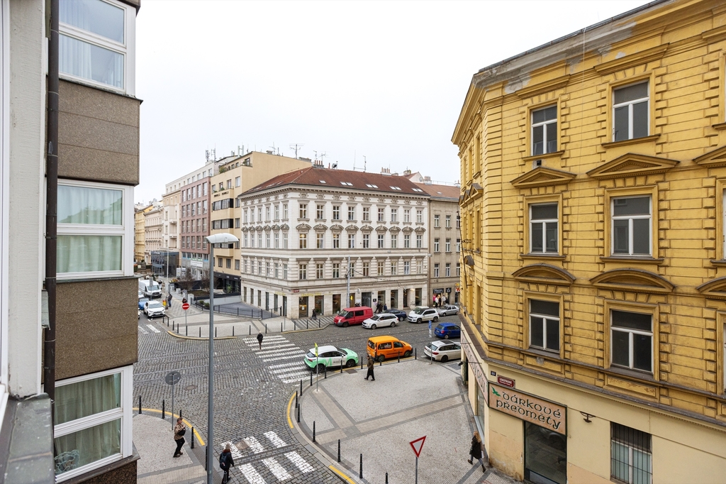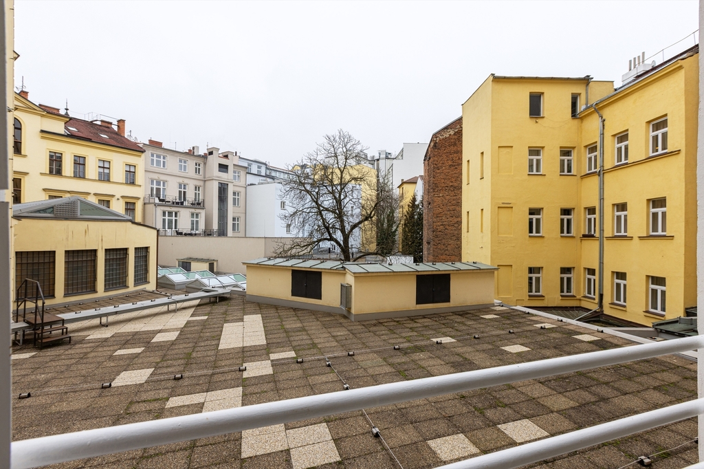 Nerušený výhled na střechy vnitrobloku si můžete vychutnat z balkonu s přístupem z kuchyně.