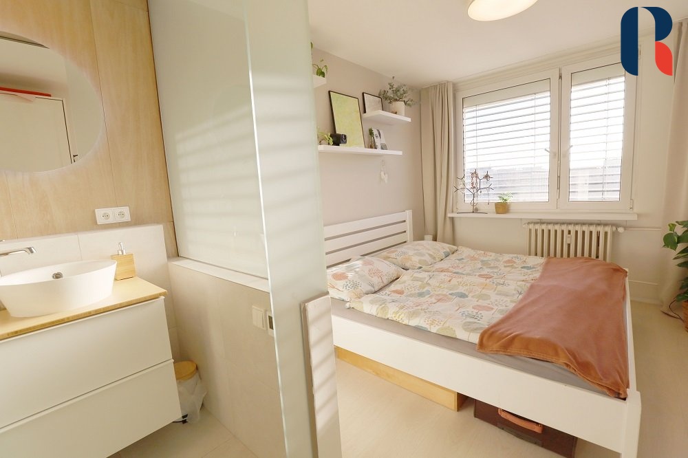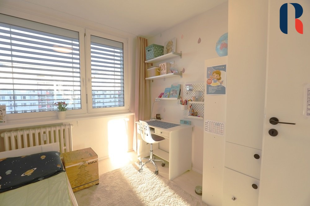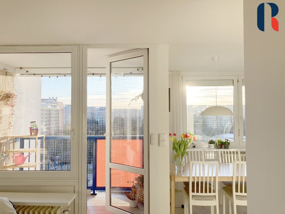 Bytová jednotka je umístěna v 9. patře s výtahem v zrekonstruovaném panelovém domě s hezkým výhledem na park před domem s oblíbenou Sakurovou alejí. Dispozičně je byt řešen jako vstupní hala propojená s obývacím pokojem, kuchyň, dva samostatné pokoje, ložnice s vlastní koupelnou, šatna/technická místnost, koupelna s wc, samostatné wc a lodžie. Je ve velmi dobrému stavu, v roce 2023 byla provedena kompletní rekonstrukce vč. nových rozvodů elektřiny, vody a odpadu. V rámci rekonstrukce byly odstraněny některé příčky, čímž vznikl atypický otevřený prostor s docílením dispozic celkem šesti místností vč. kuchyně.