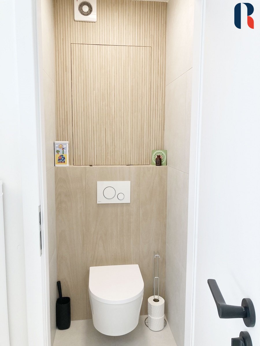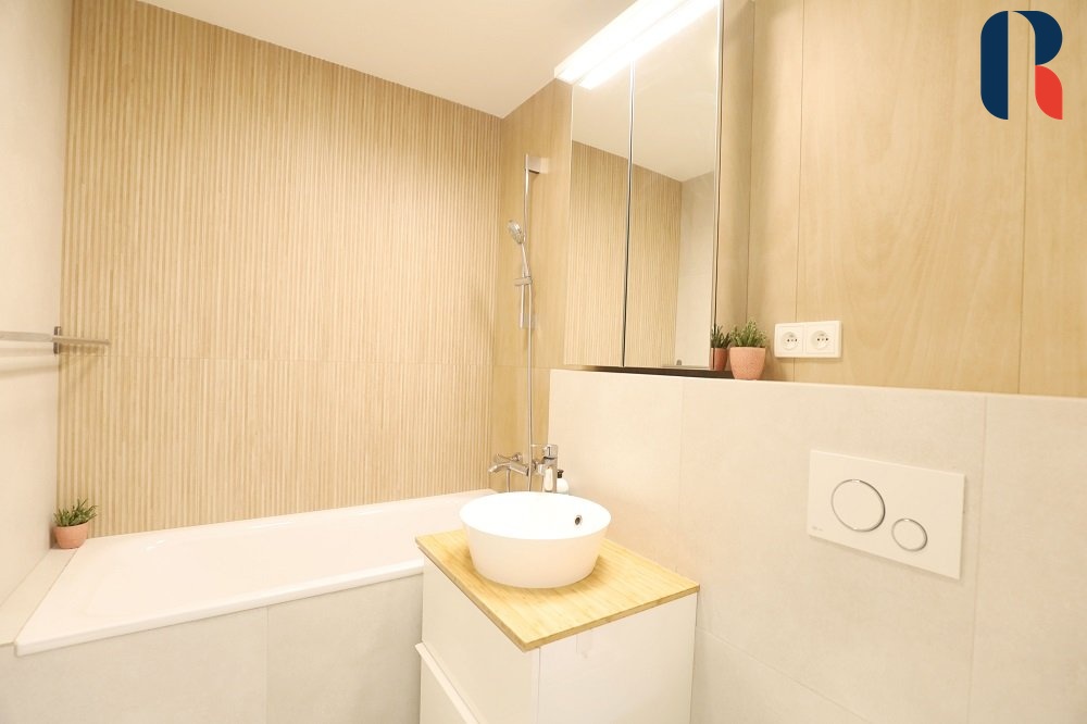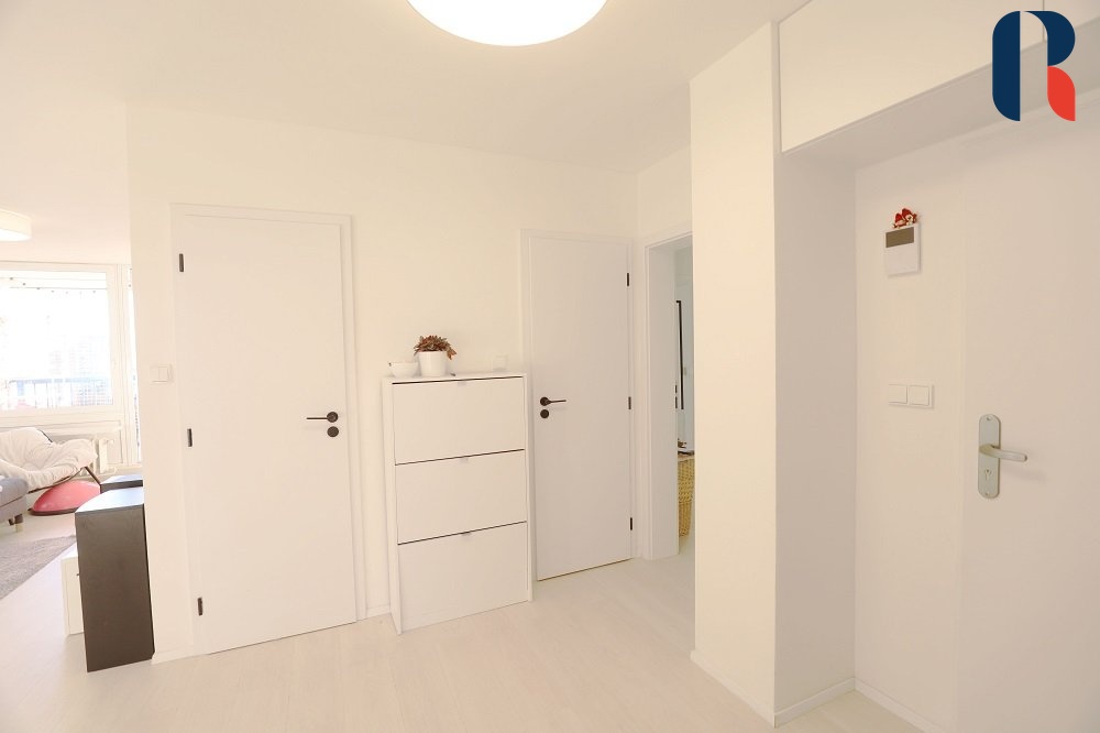 Při vstupu do bytu se ocitnete v prostoru, který se po rekonstrukci vymyká standardně řešeným panelovým bytům. Působí příjemným a útulným dojmem díky dostatku přirozeného světla, velkým oknům, pečlivě vybíranému a nadstandardně vybavenému interiéru.